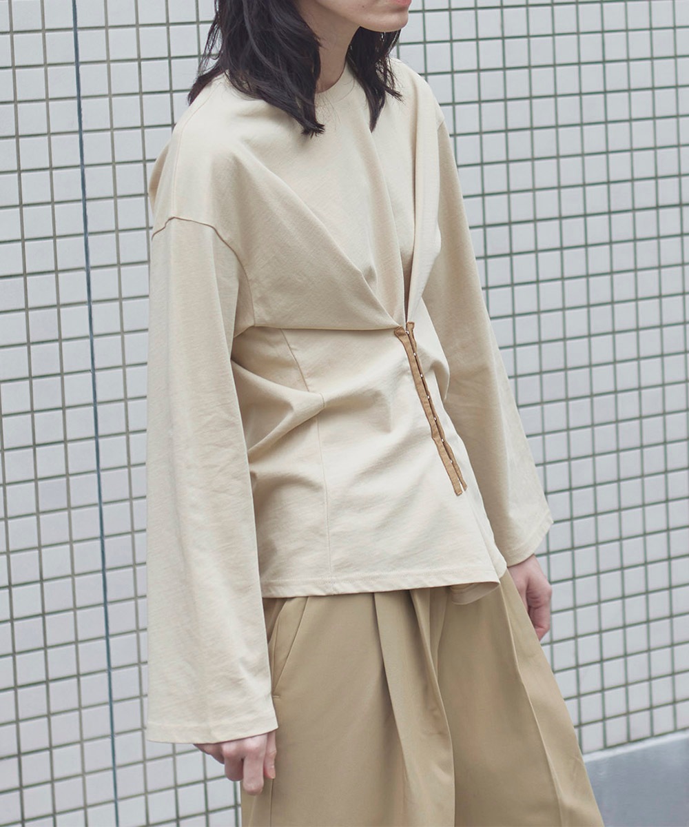 フロント部分でホックを留めるとタックデザインになり、ワイドスリーブが抜け感を演出してくれます。