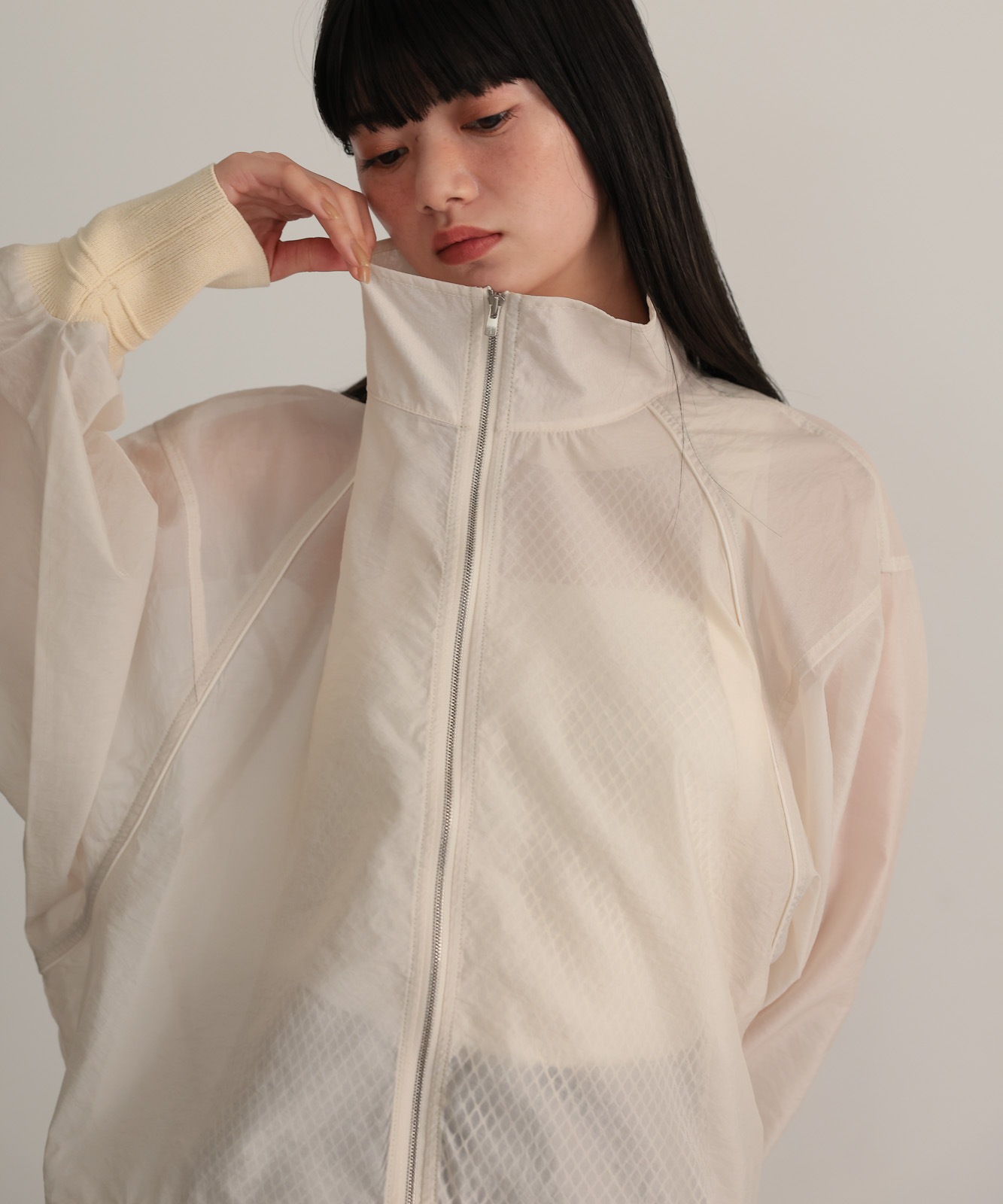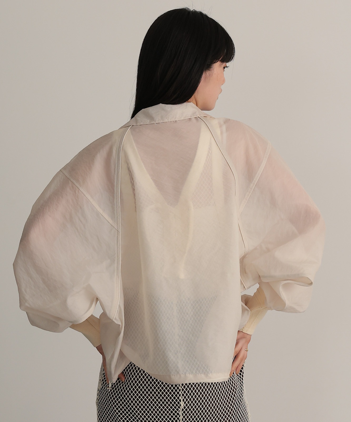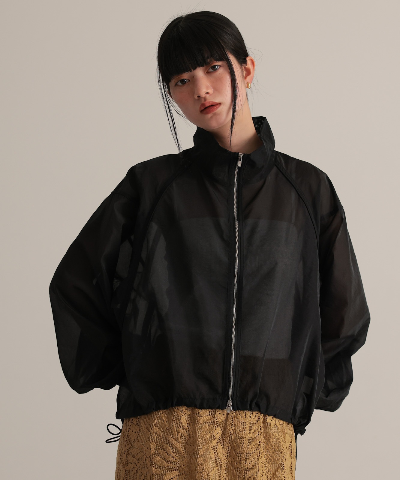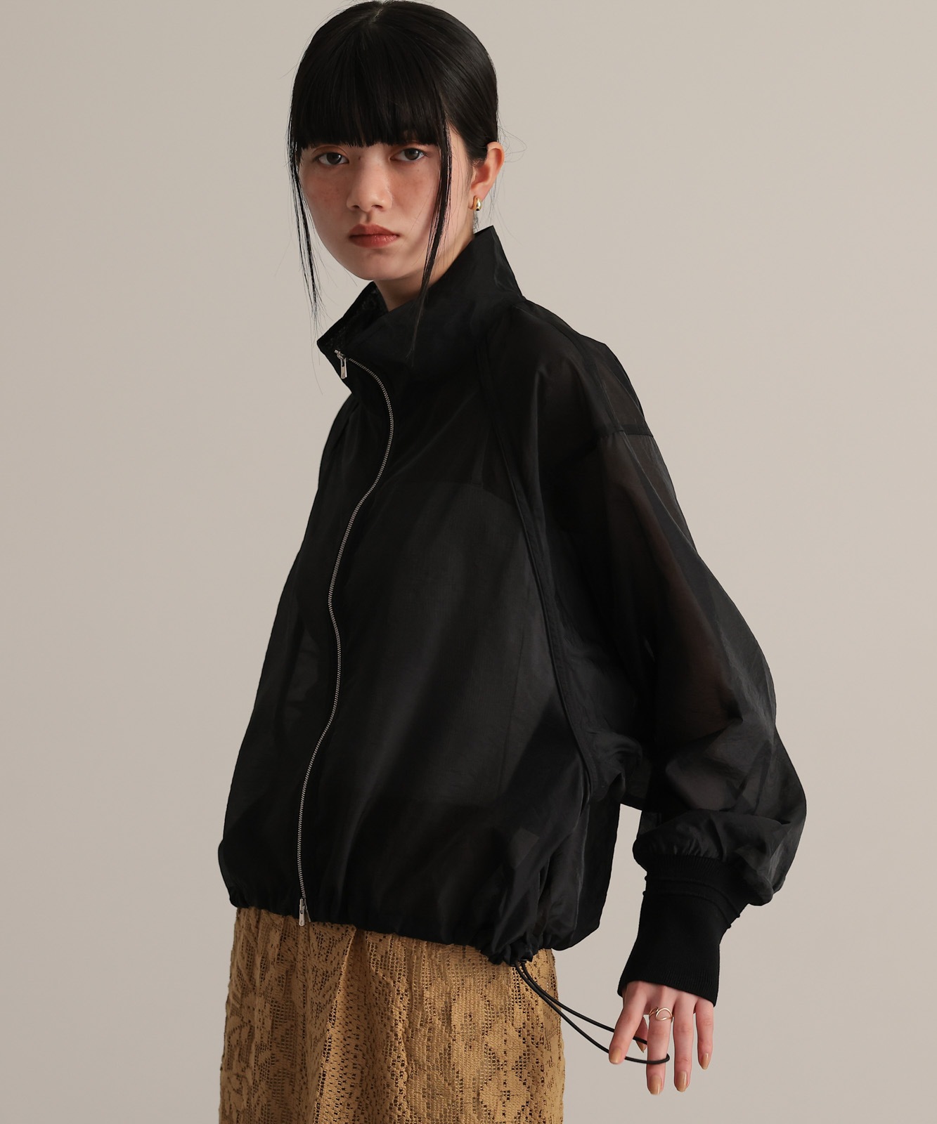 シアー素材で仕上げたラグランスリーブブルゾン