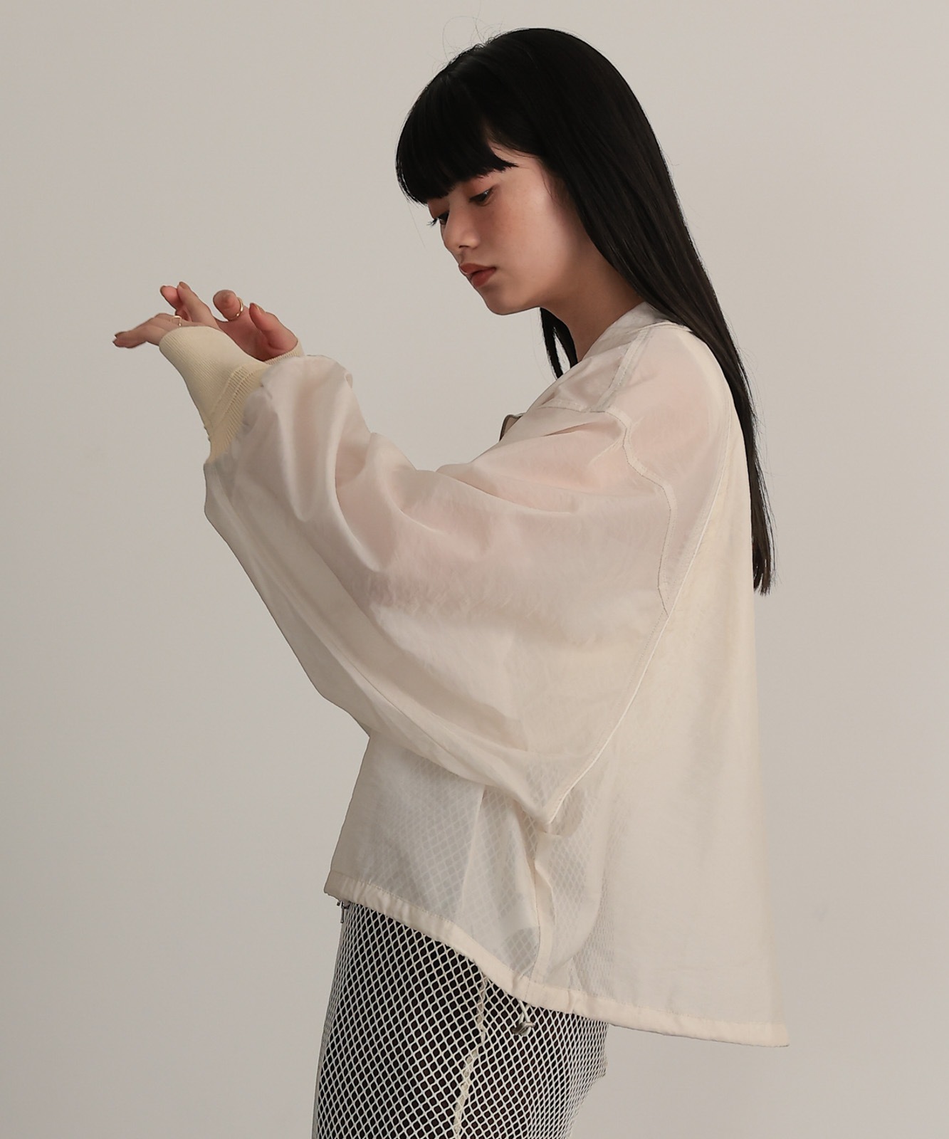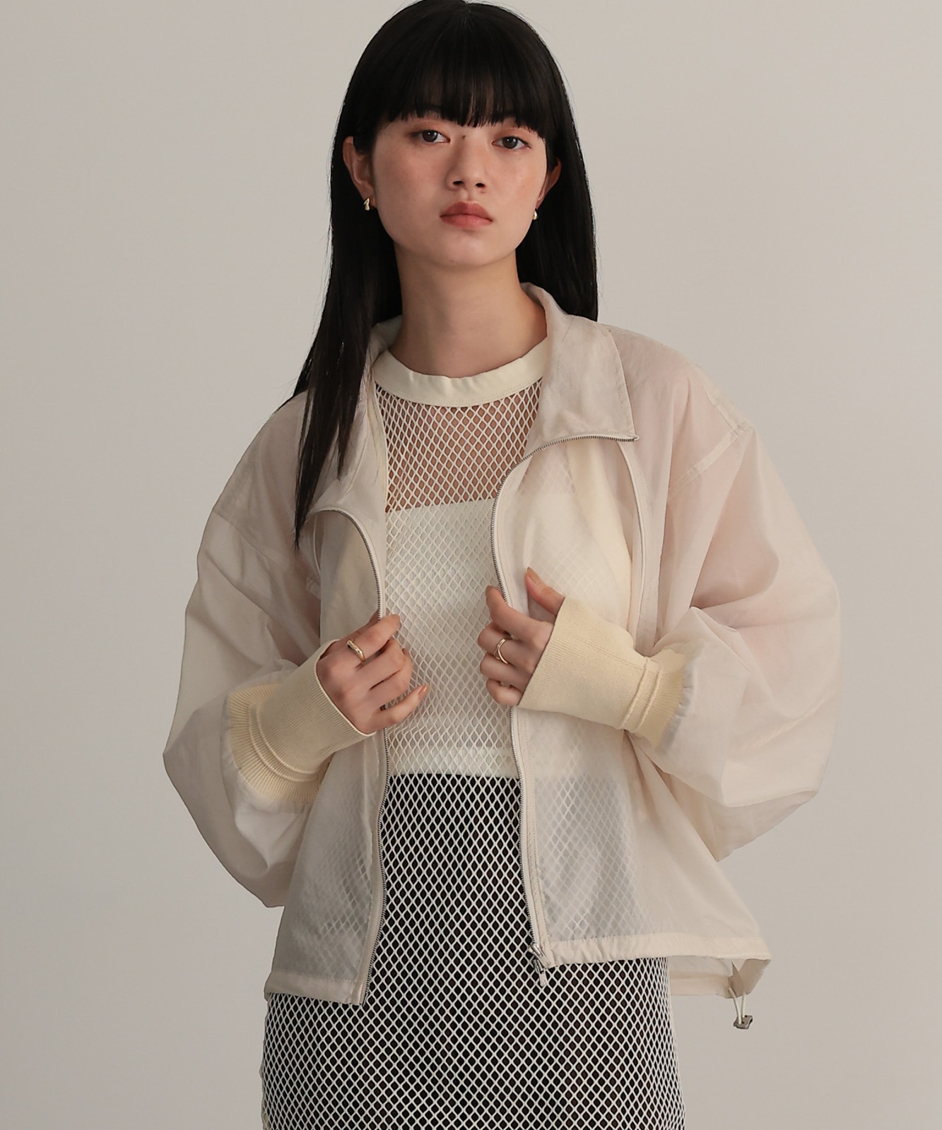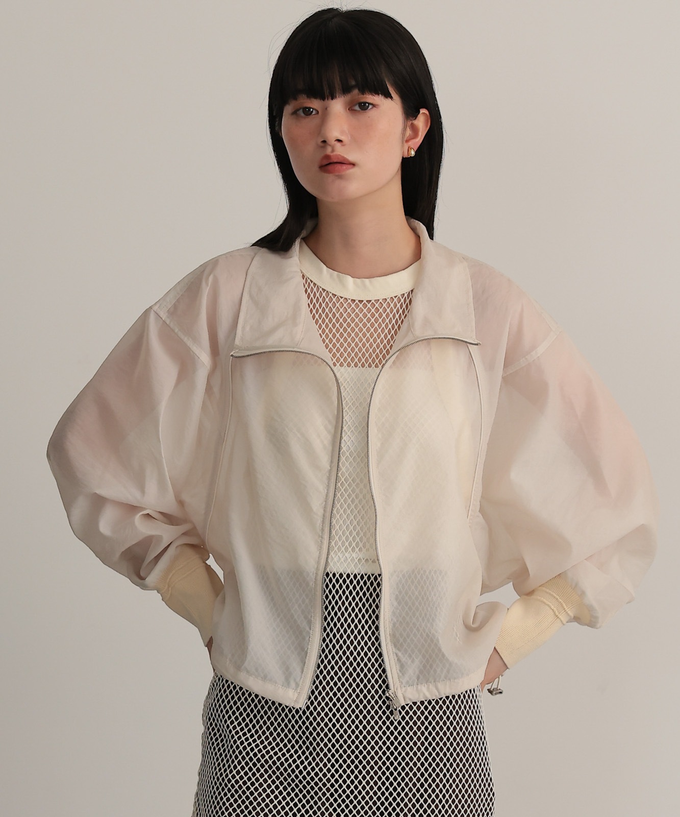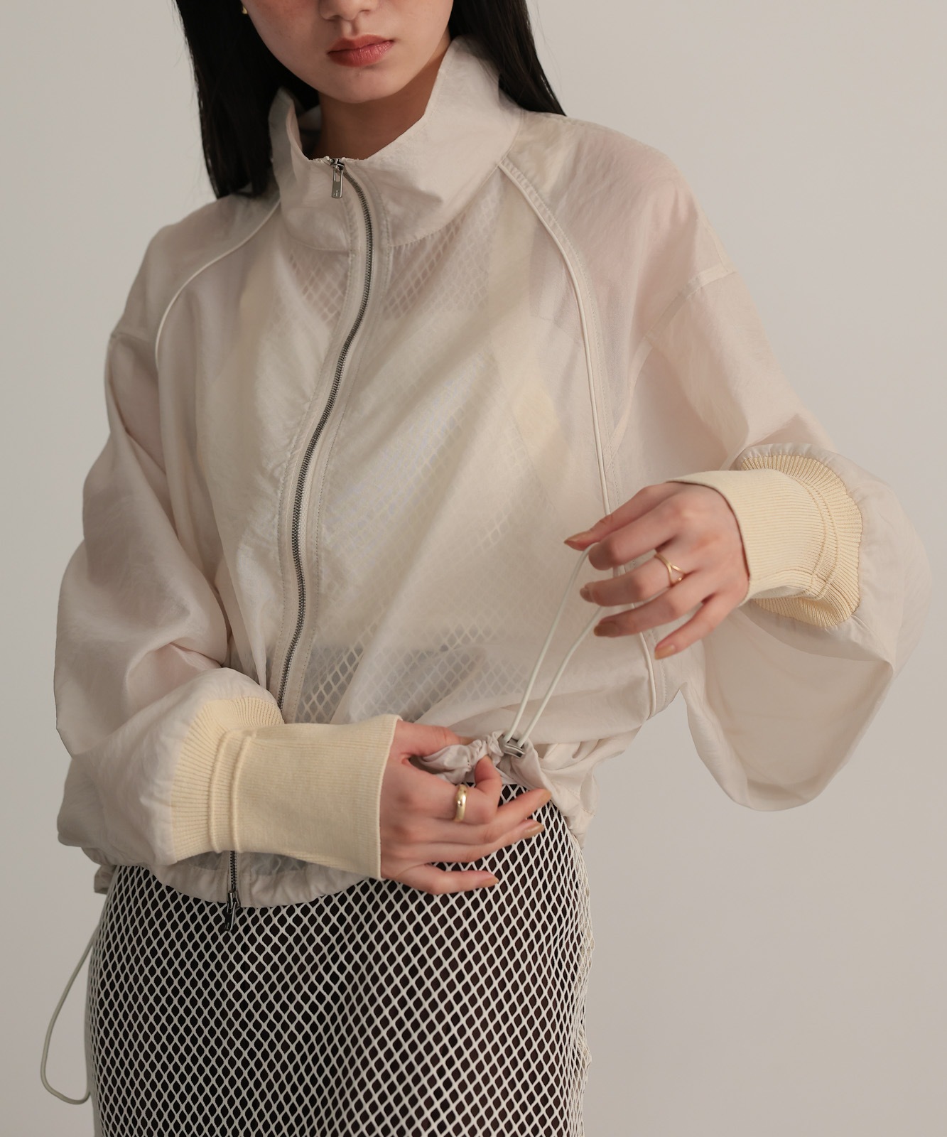シアー素材で仕上げたラグランスリーブブルゾン
