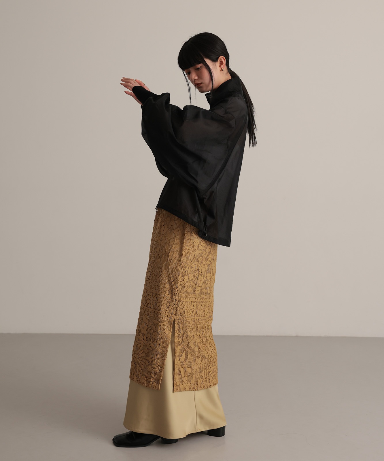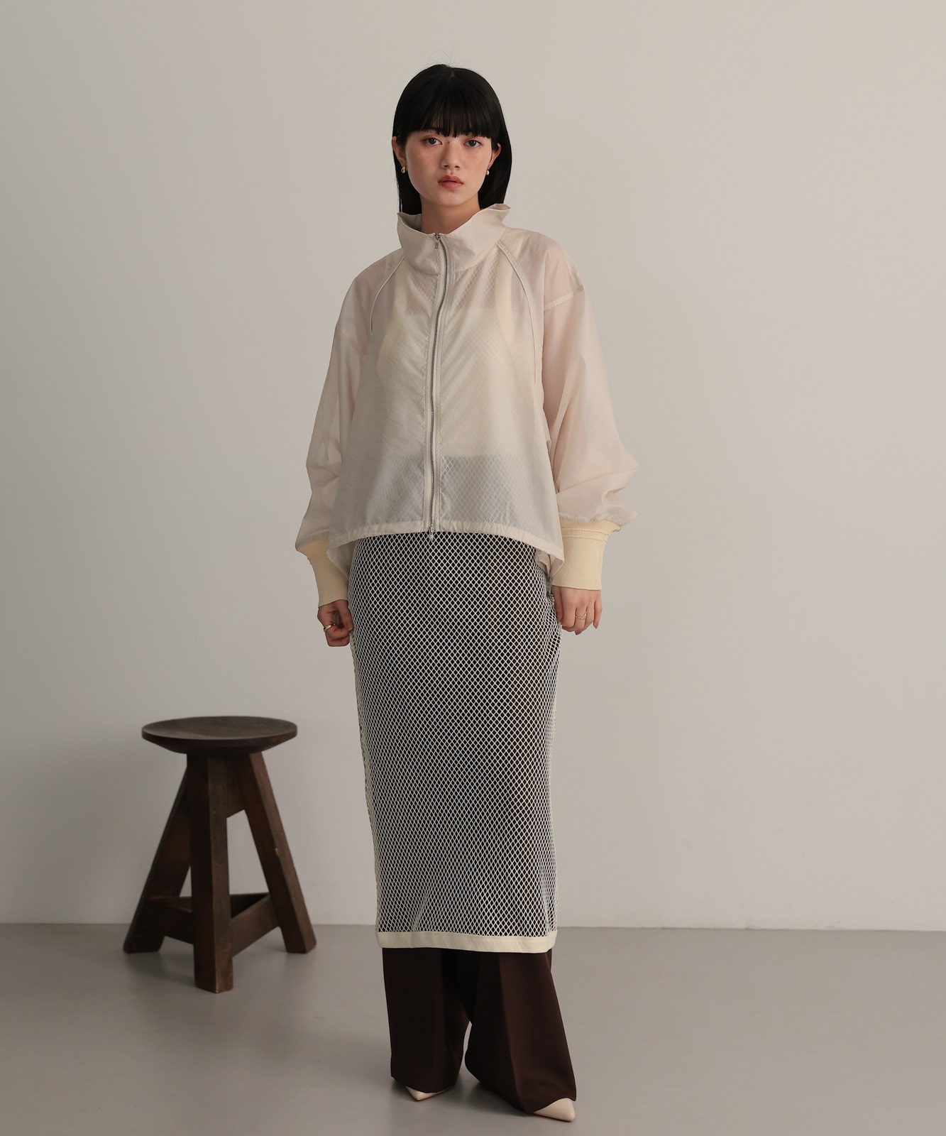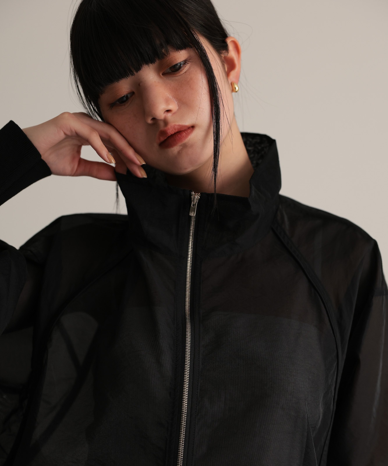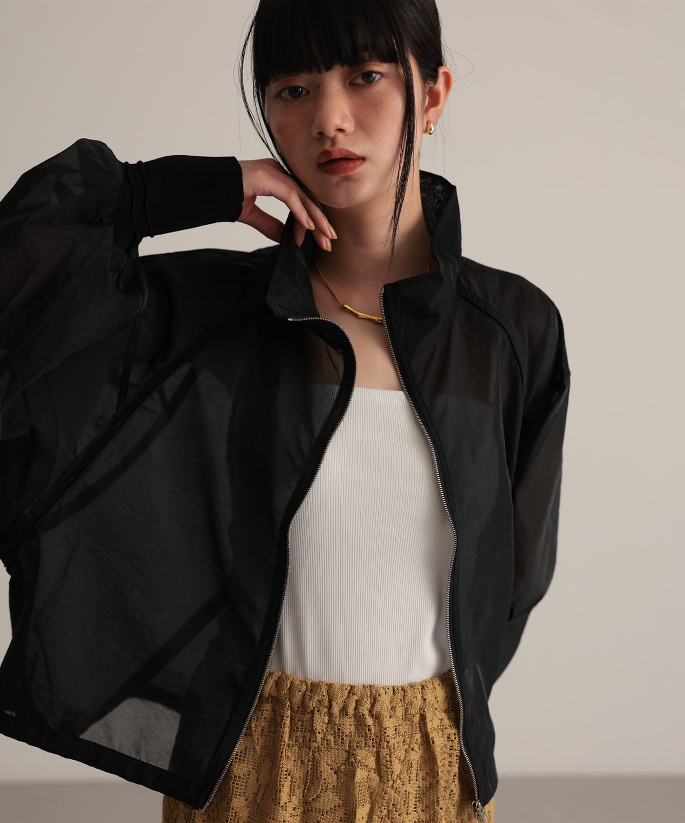 シアー素材で仕上げたラグランスリーブブルゾン