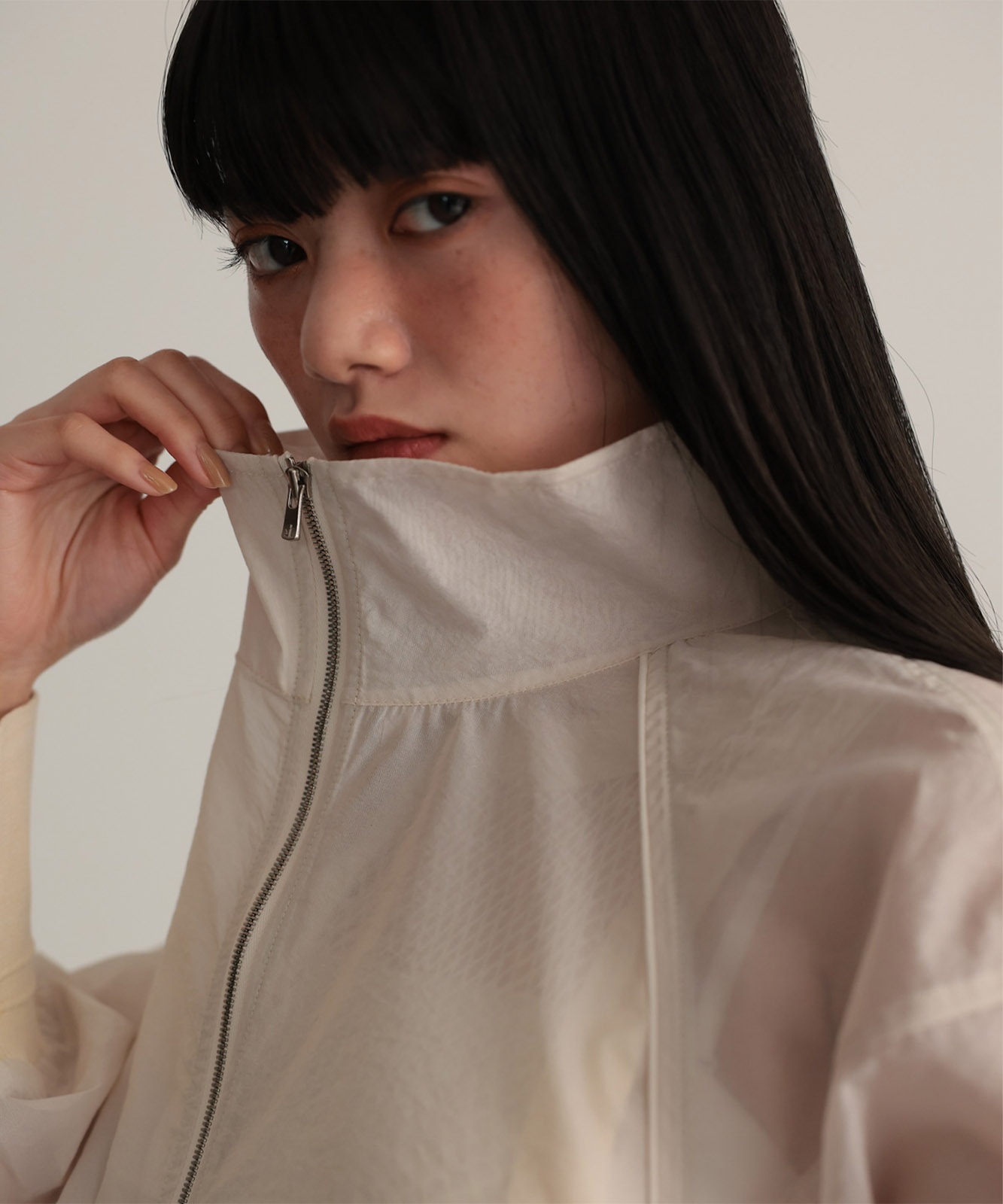 ダブルジップなので上下両方から開けられてスタイリングに合わせてアレンジできます。