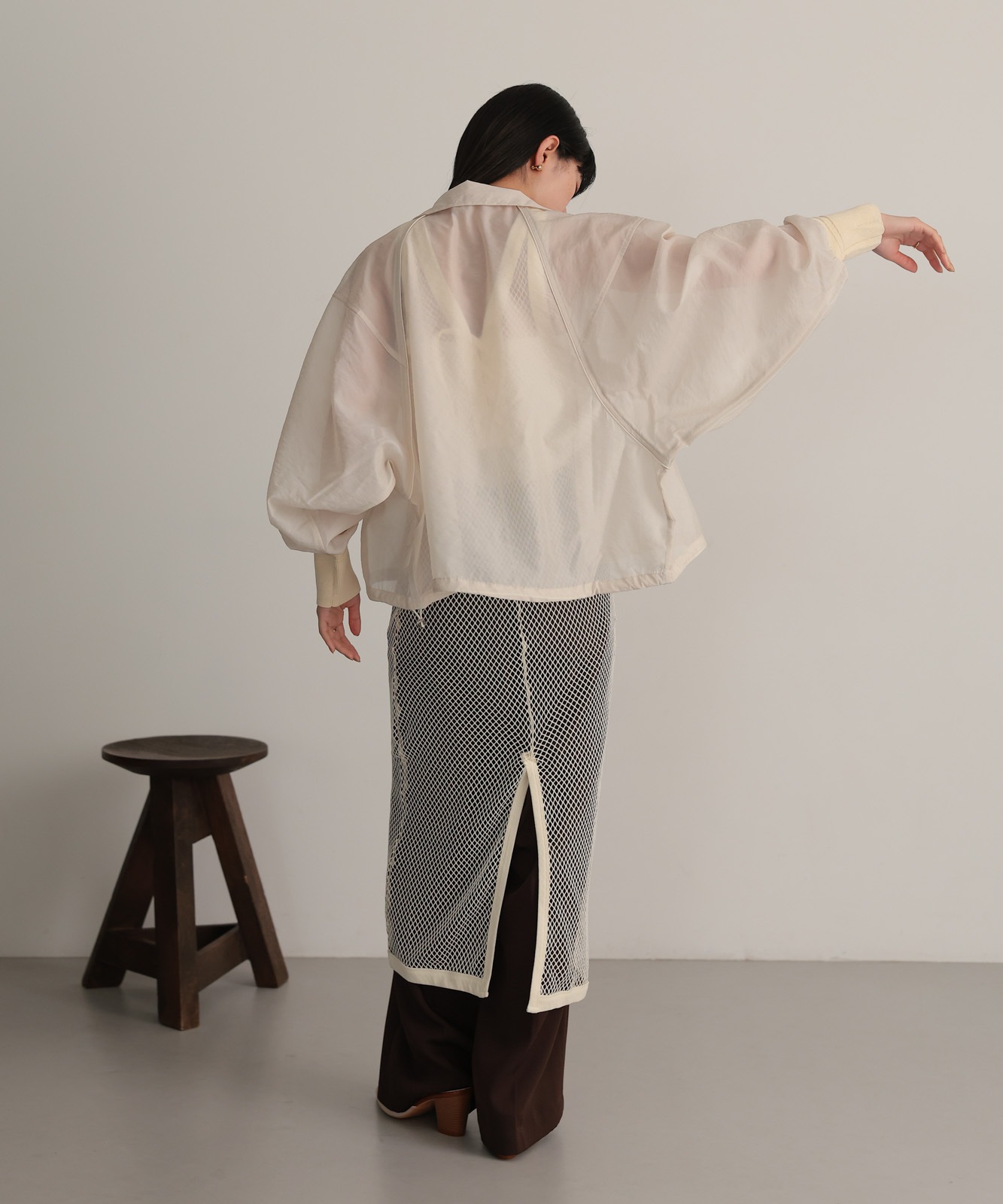 身巾とアームにたっぷりとゆとりを持たせ、後ろ丈がやや長いドルマンシルエットのブルゾン。