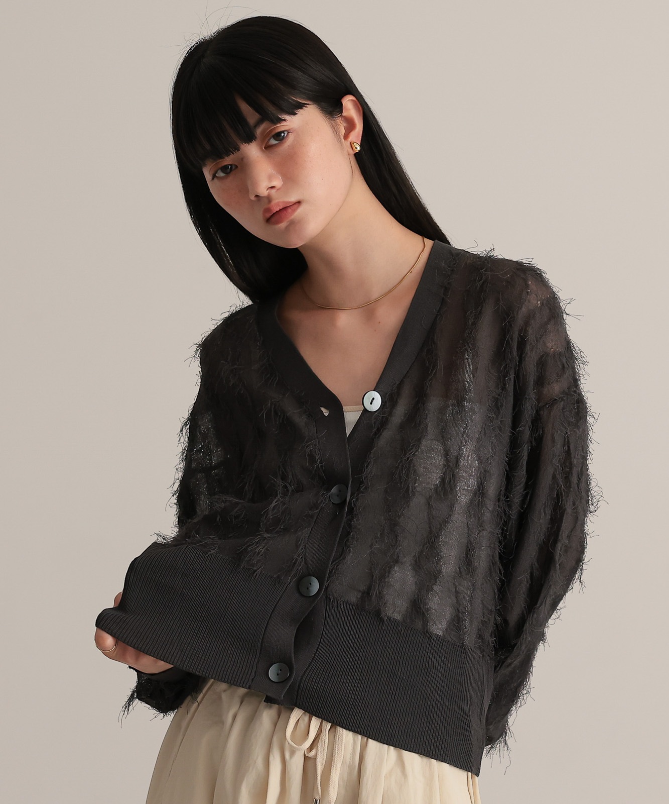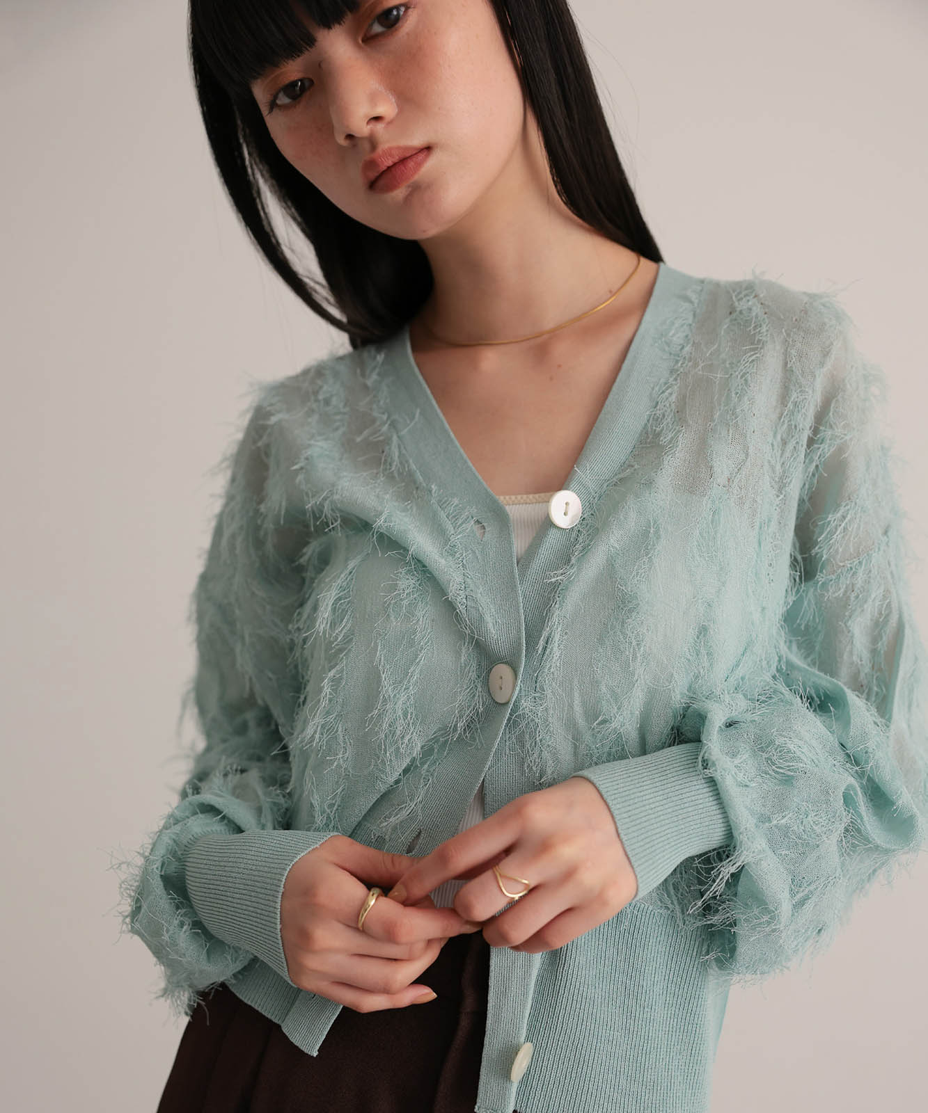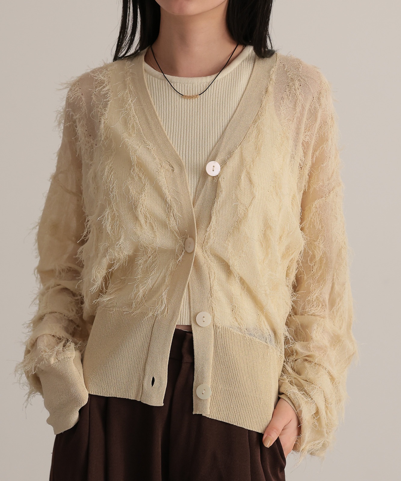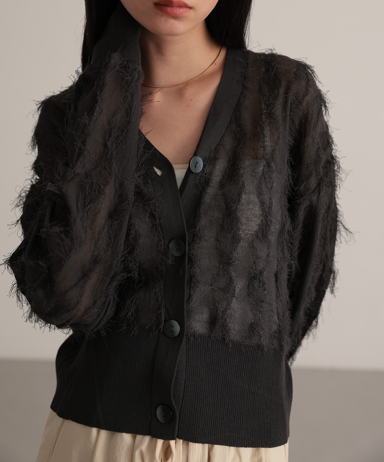 シアー感とフリンジのコントラストが新鮮なVネックカーディガン