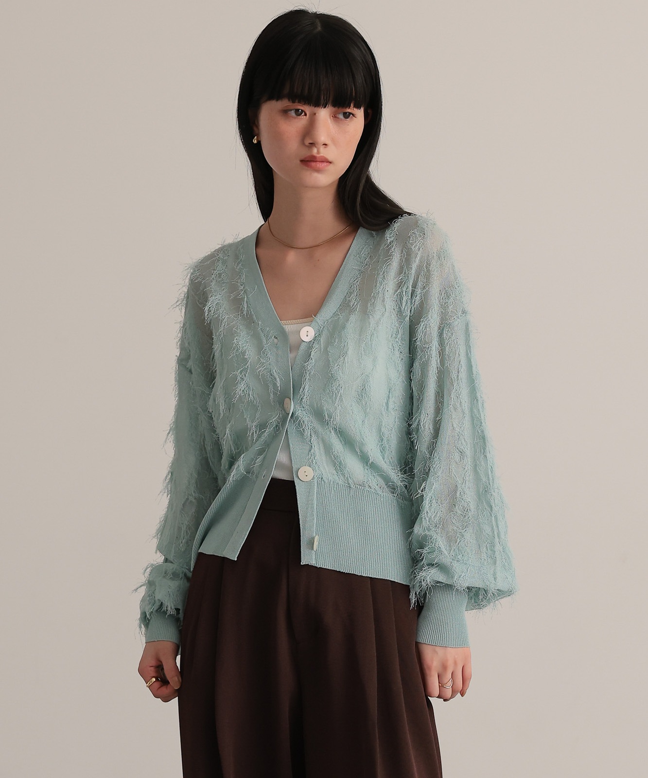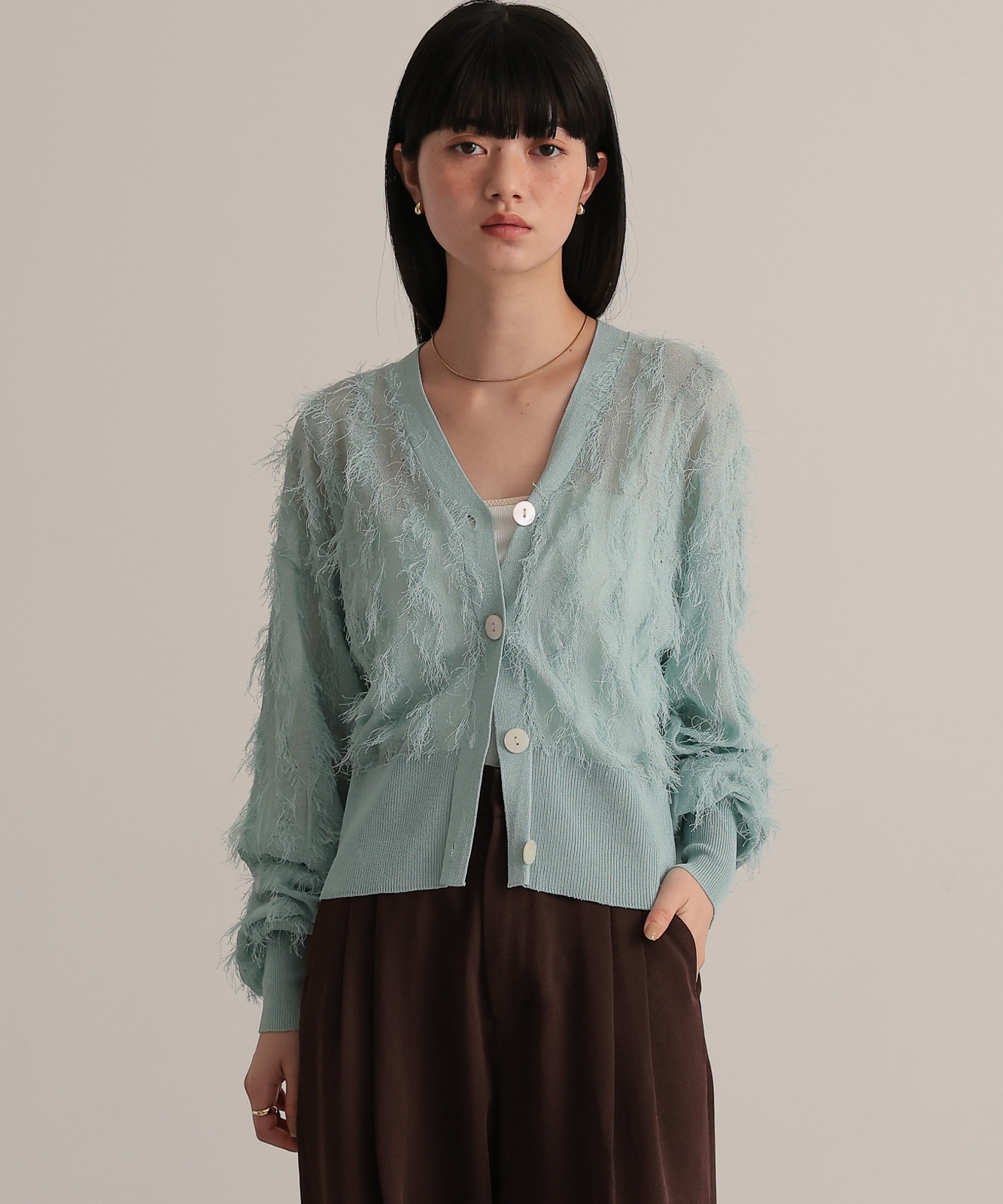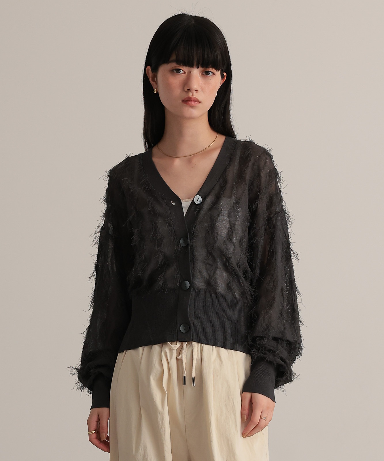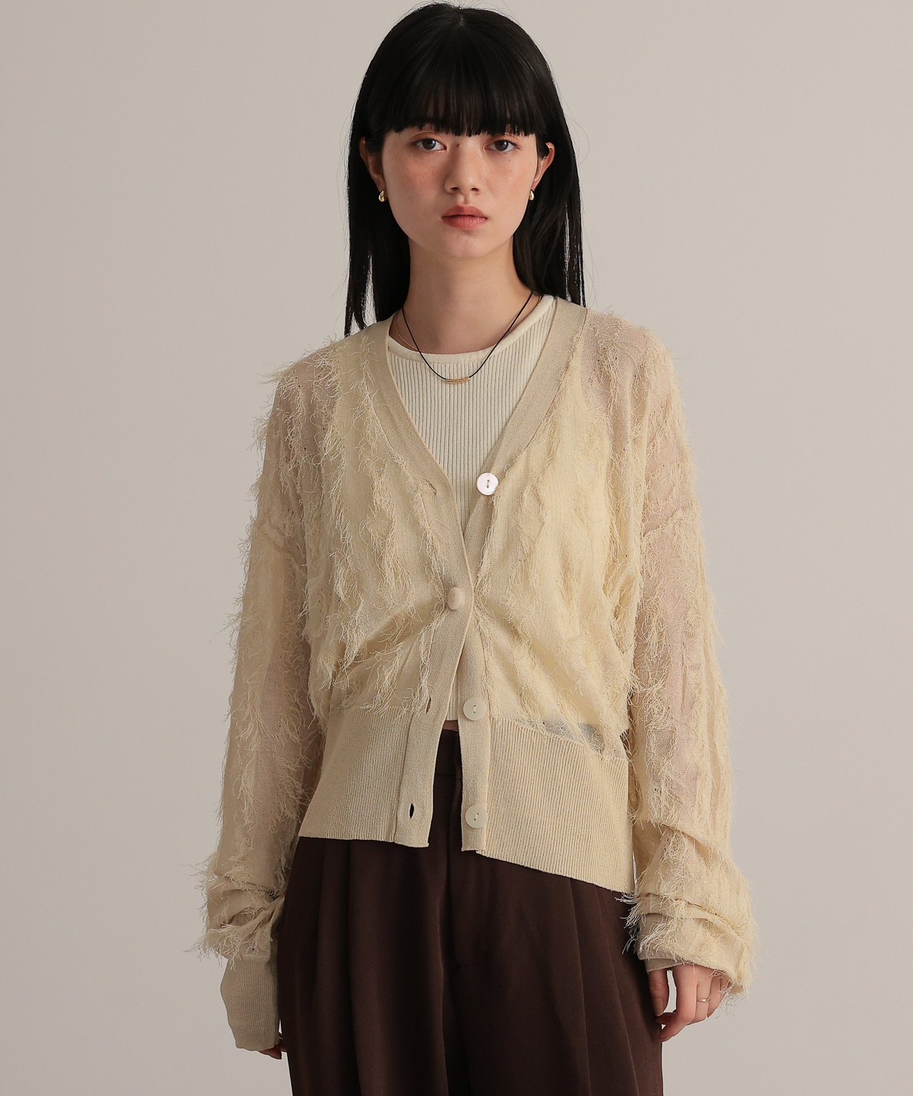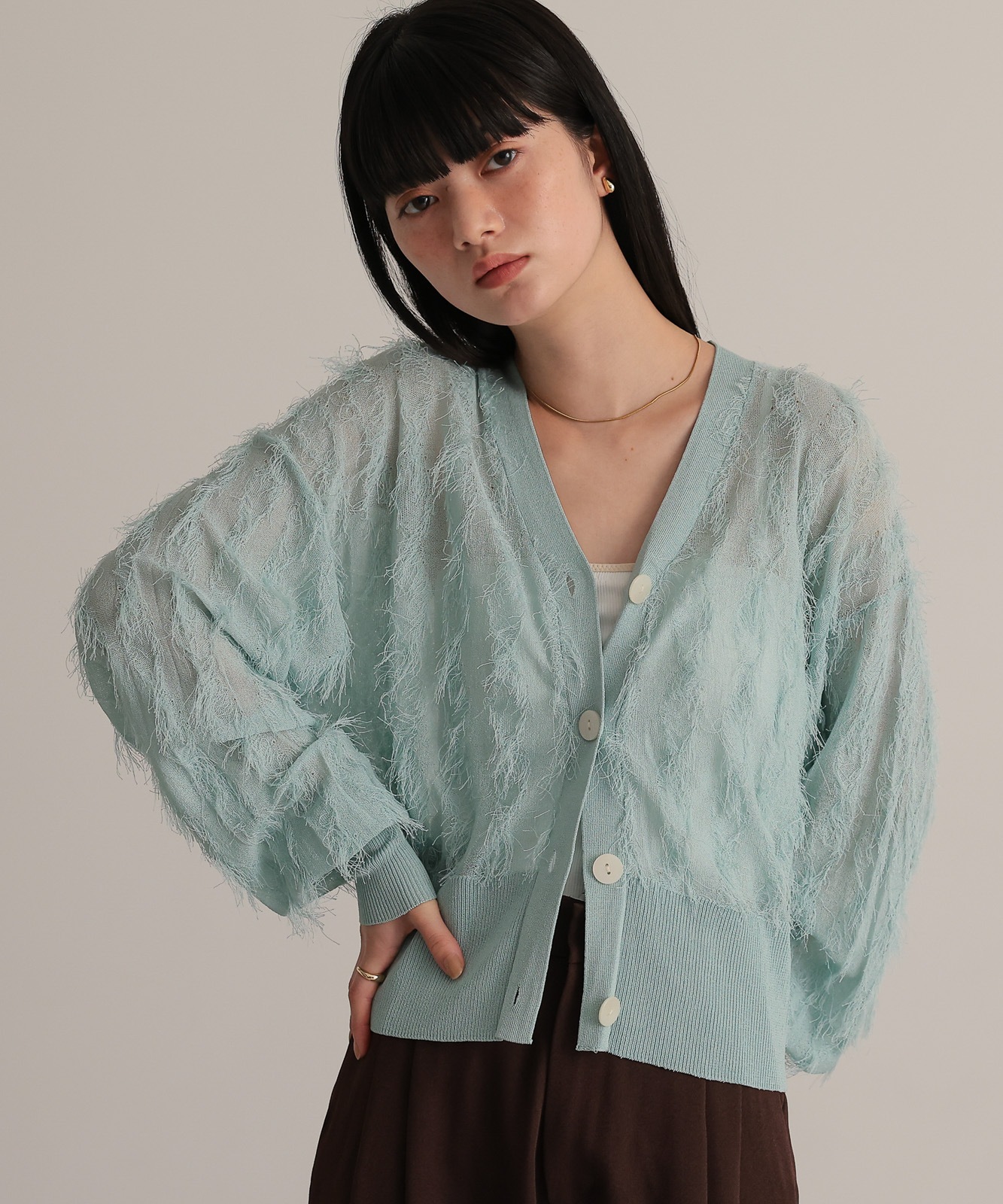 シアー感とフリンジのコントラストが新鮮なVネックカーディガン