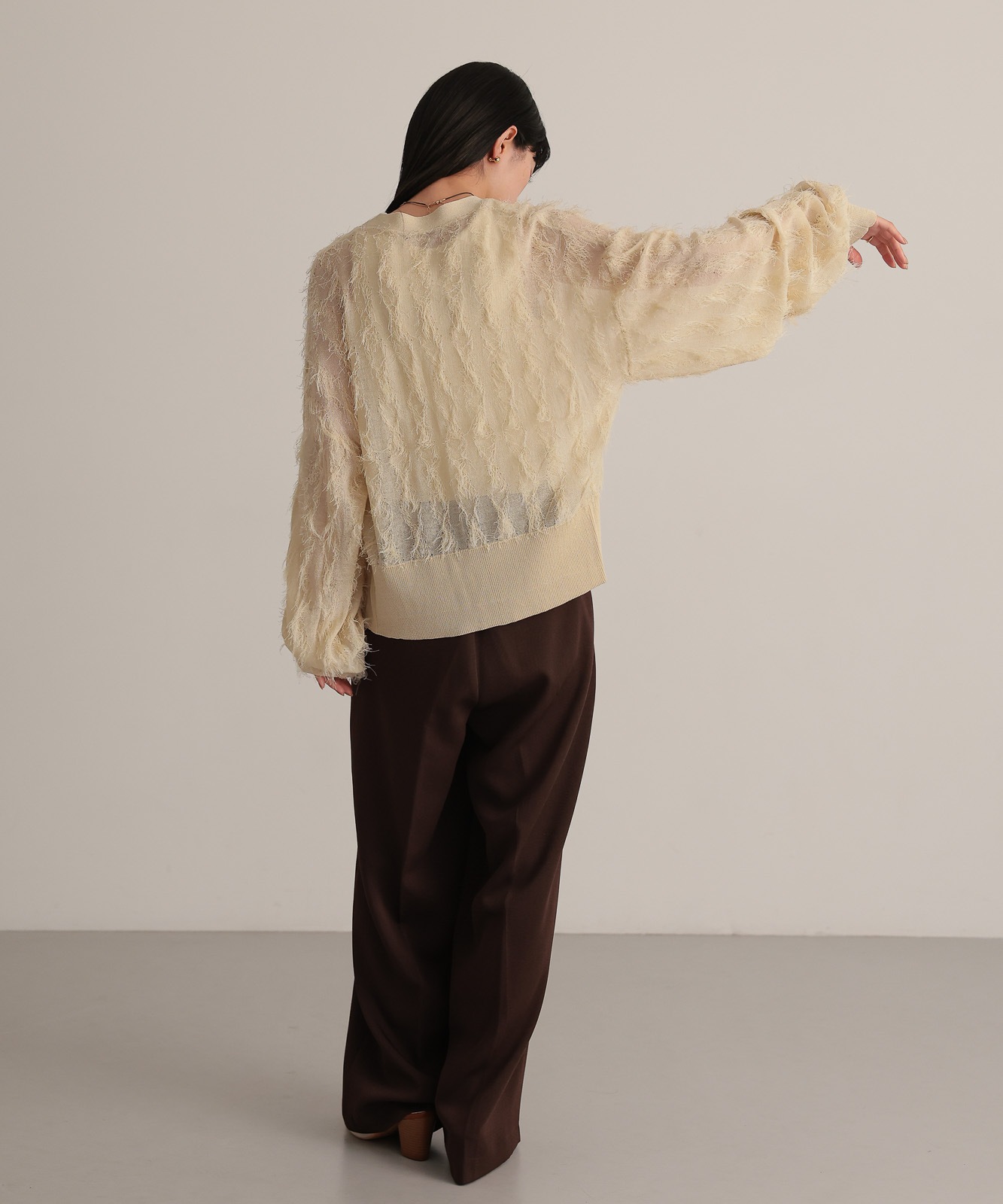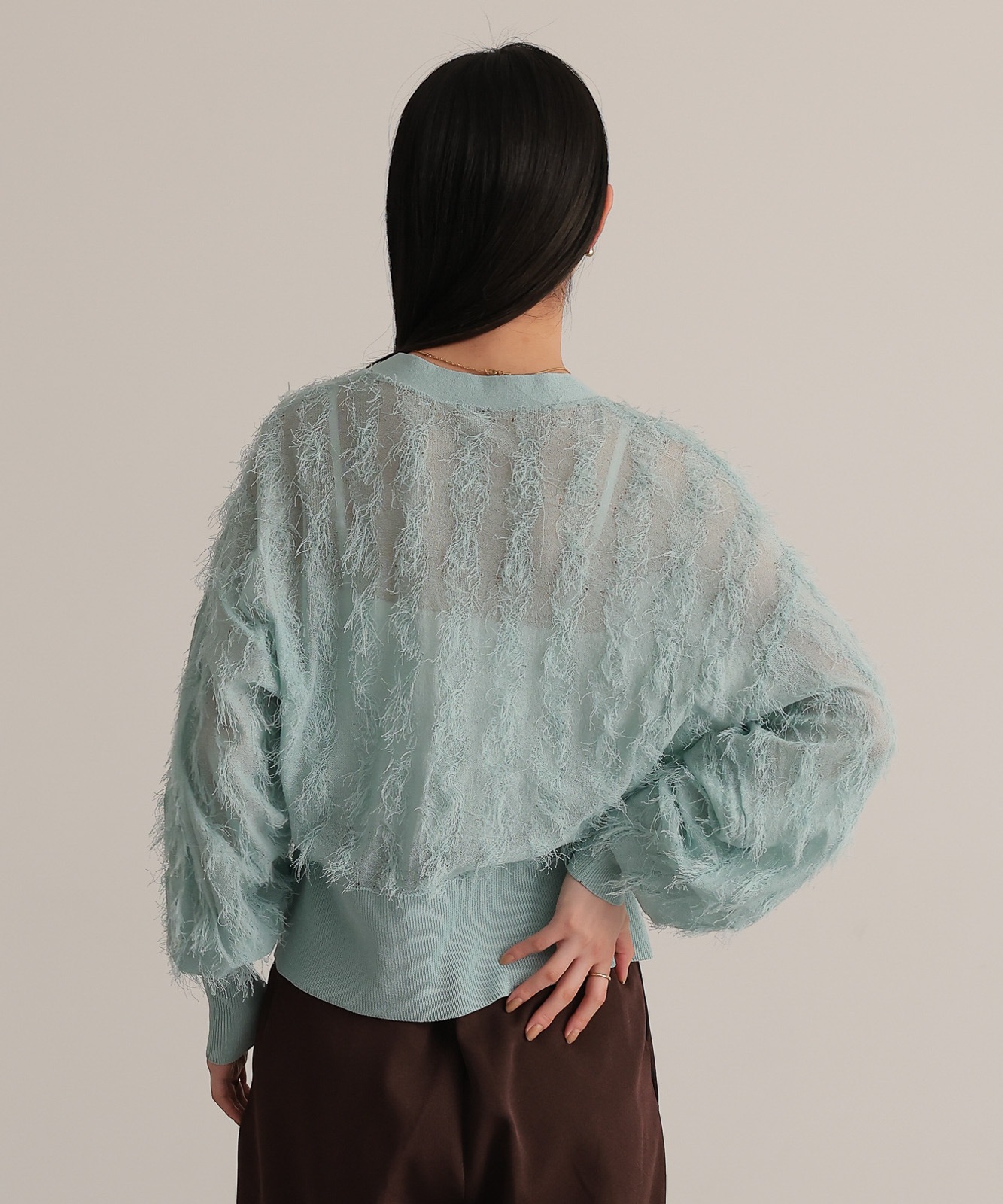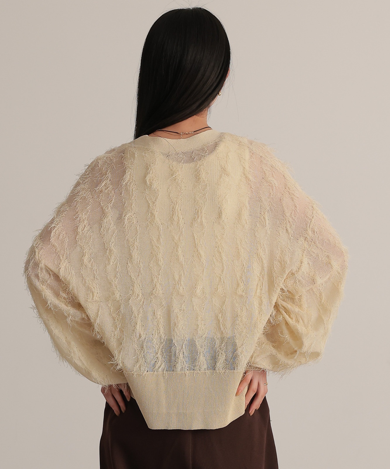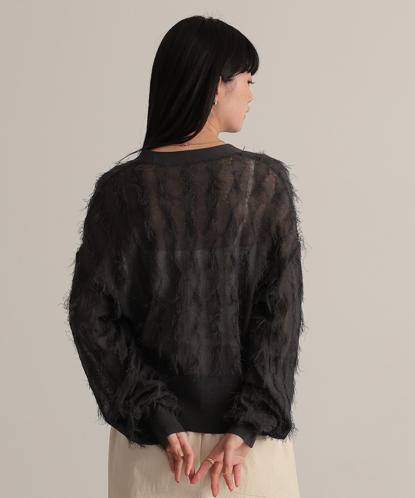 繊細な糸で編んだフリンジジャガードは程よく透け感あり、軽やかな着心地です。