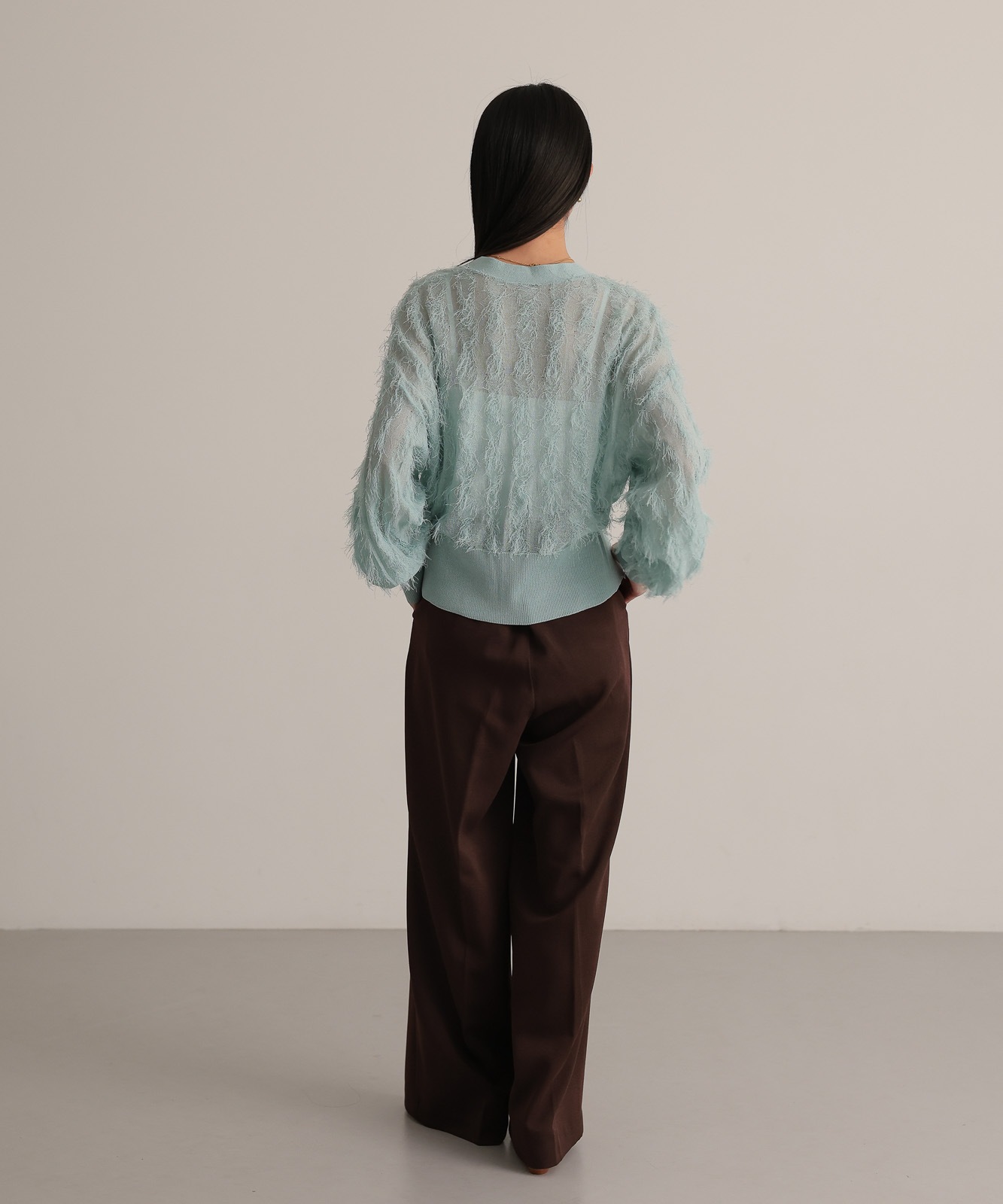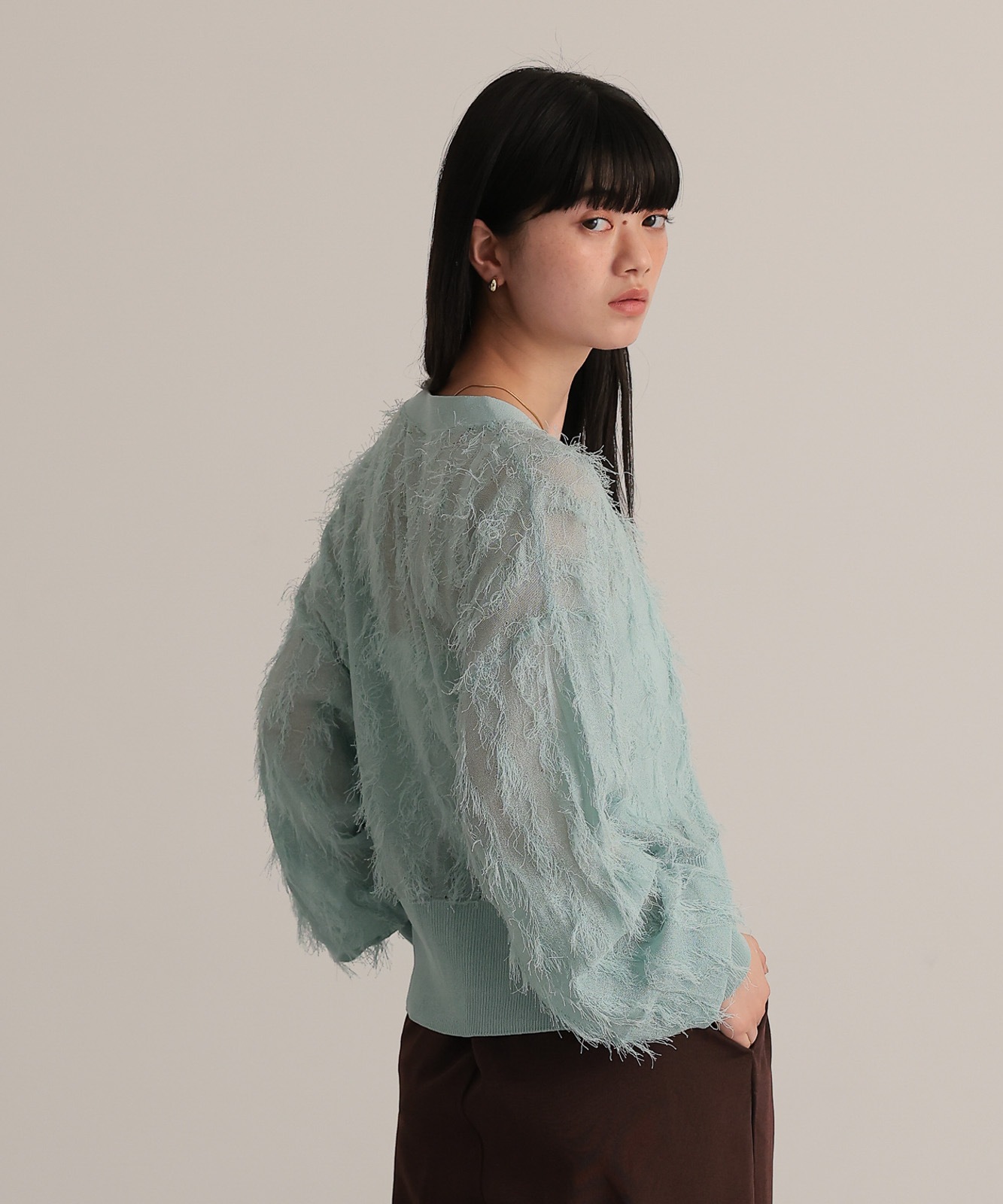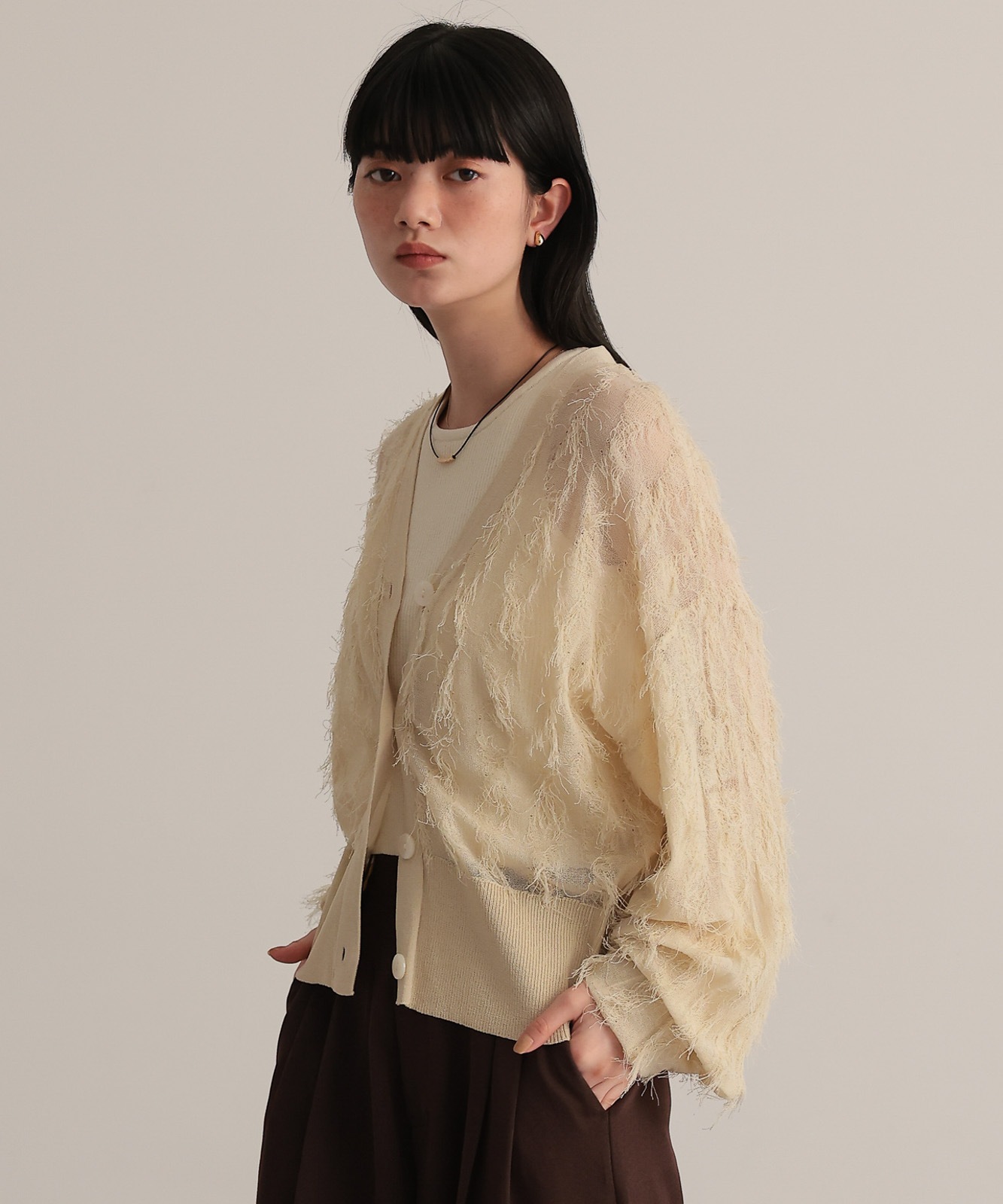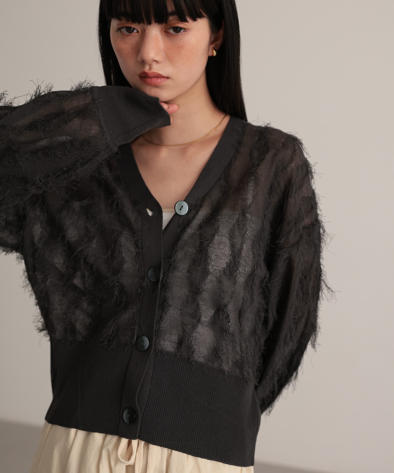 繊細な糸で編んだフリンジジャガードは程よく透け感あり、軽やかな着心地です。