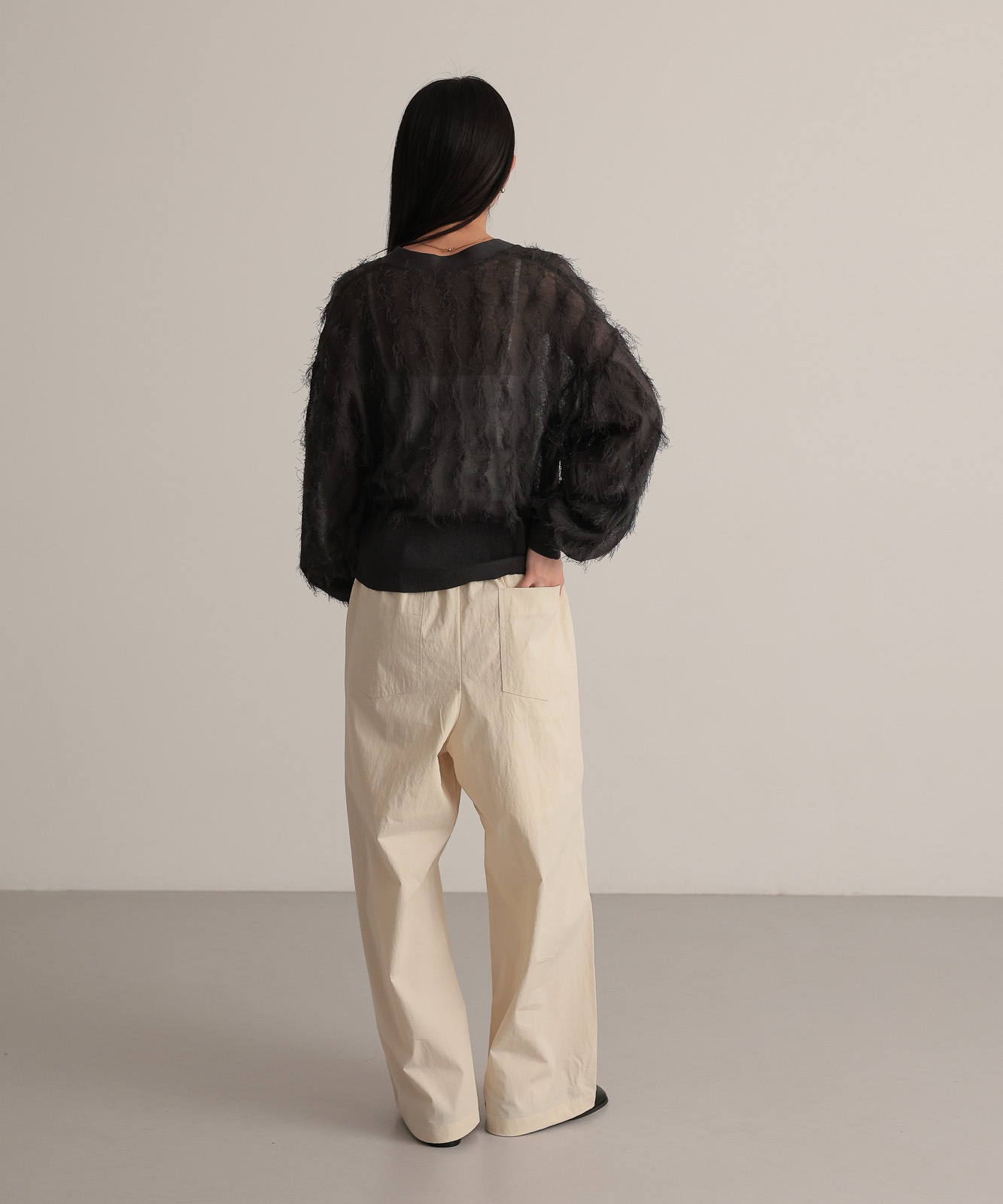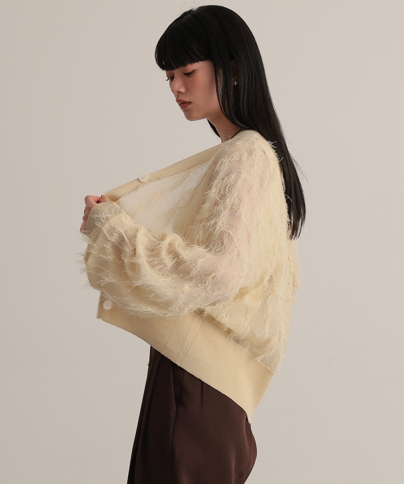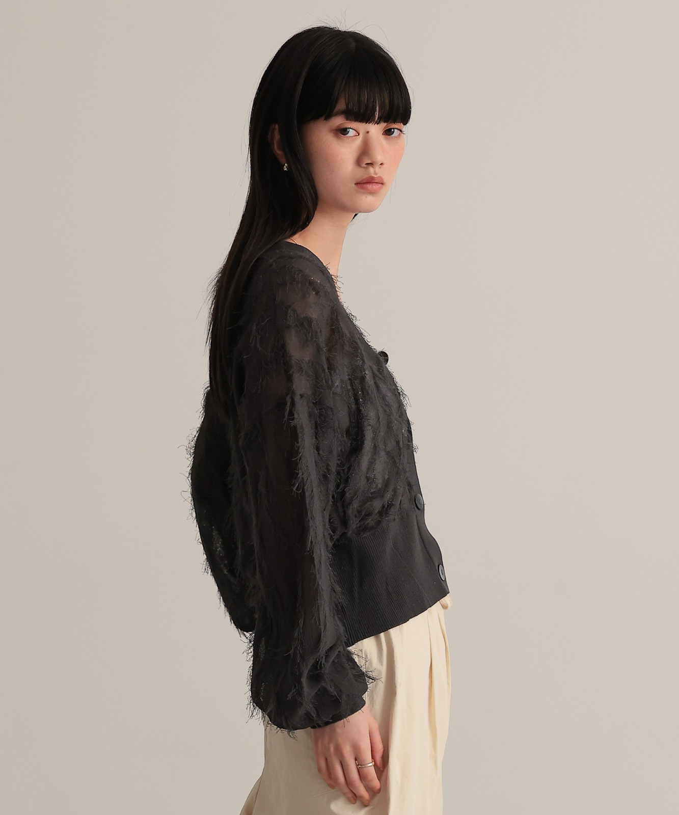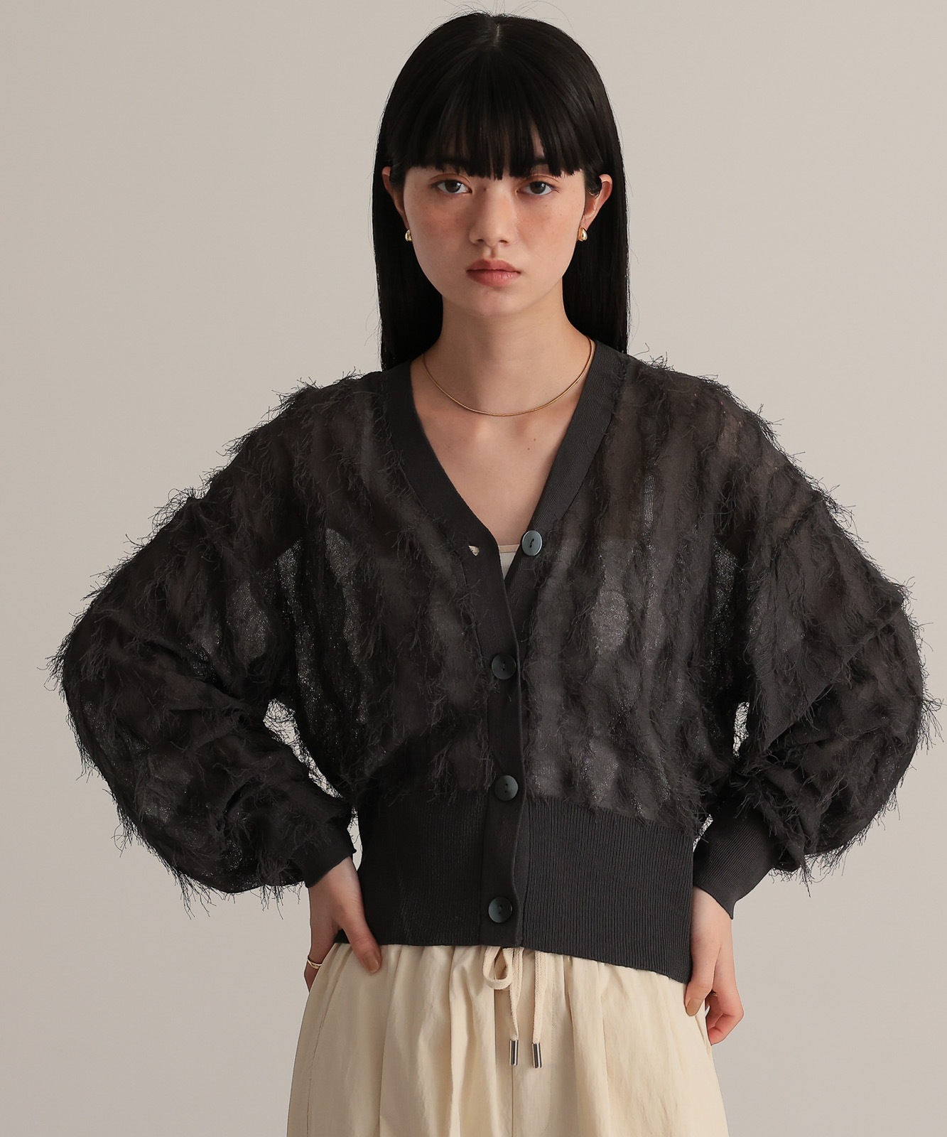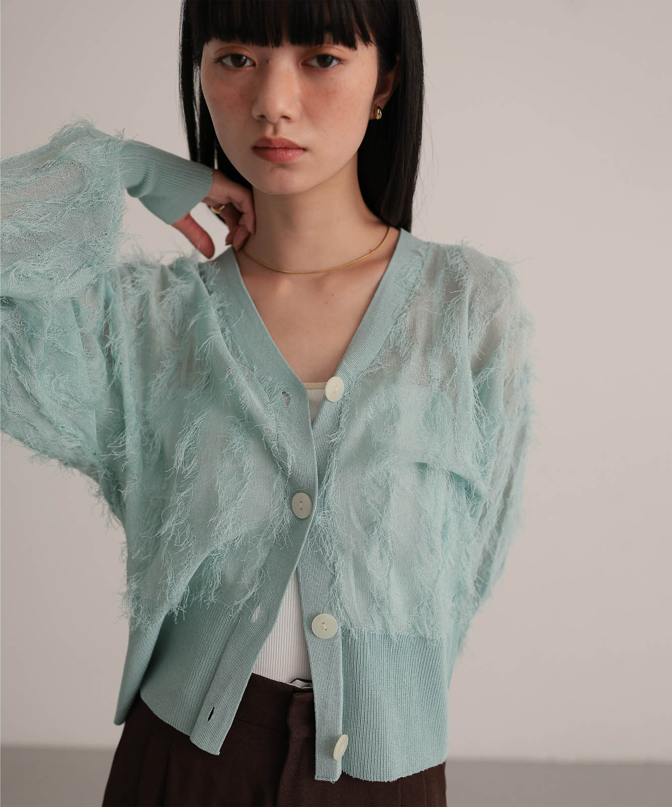繊細な糸で編んだフリンジジャガードは程よく透け感あり、軽やかな着心地です。