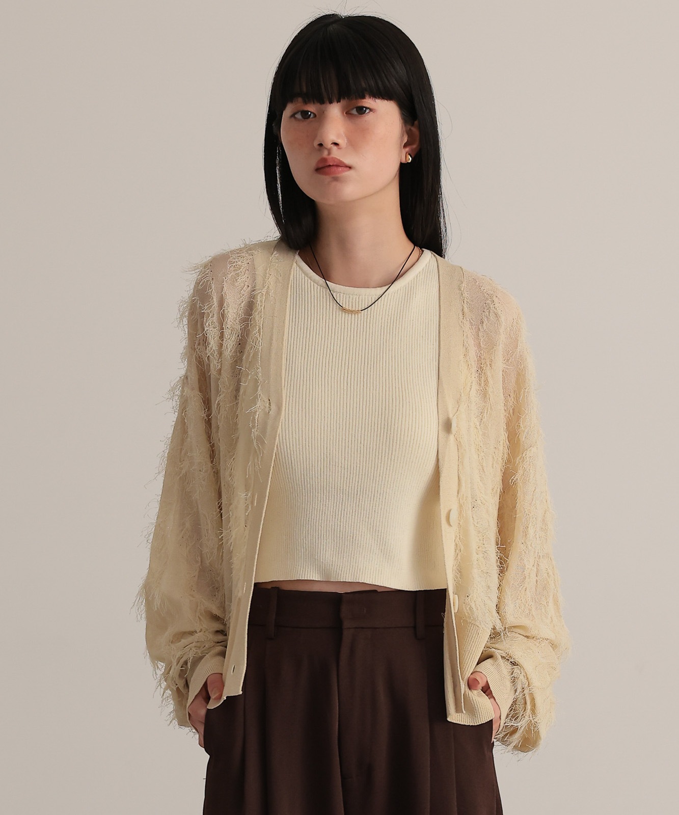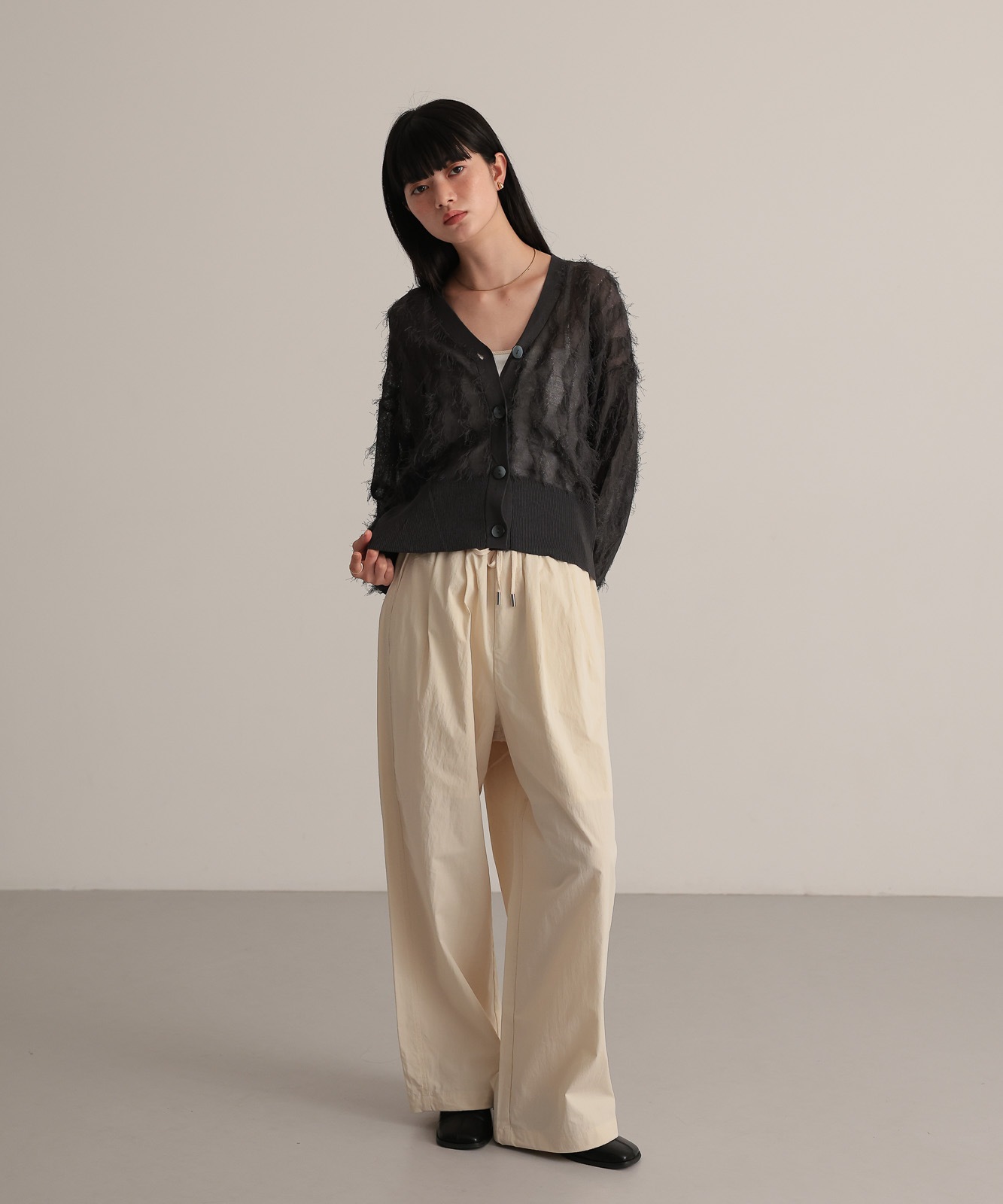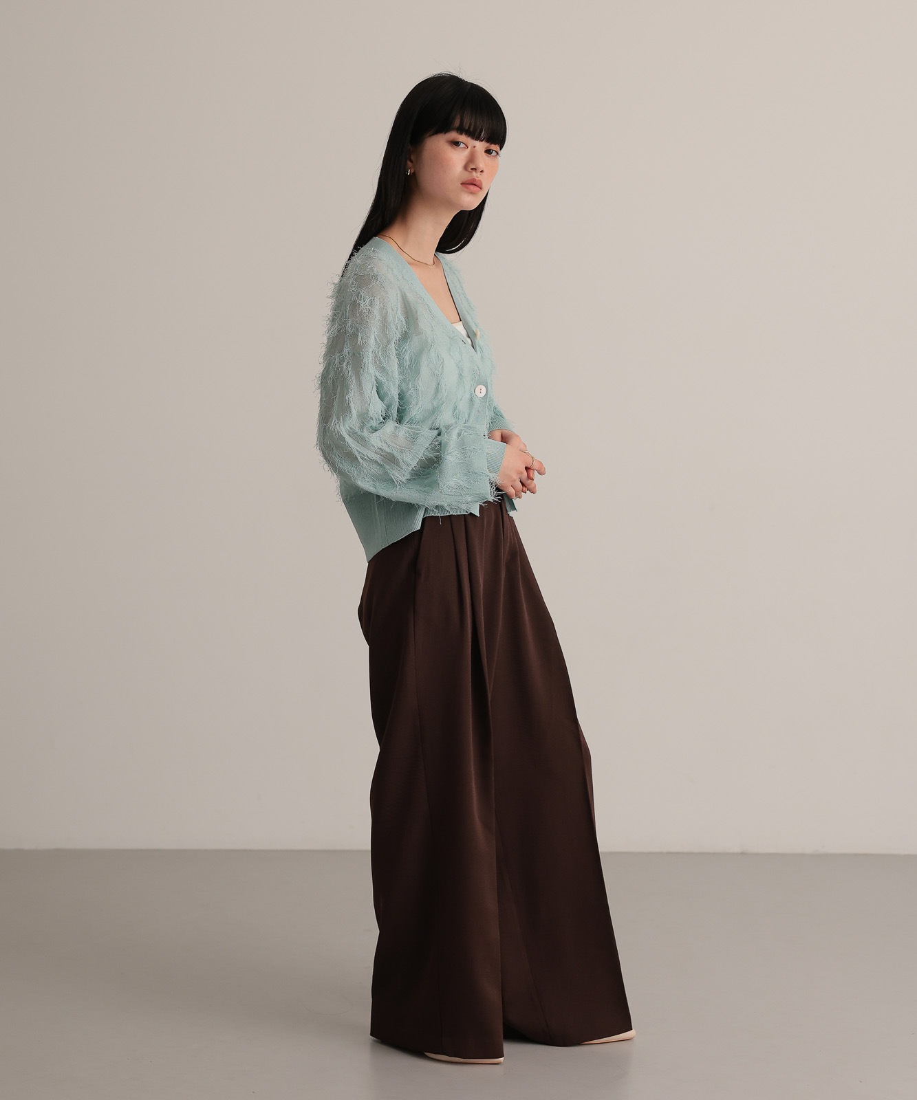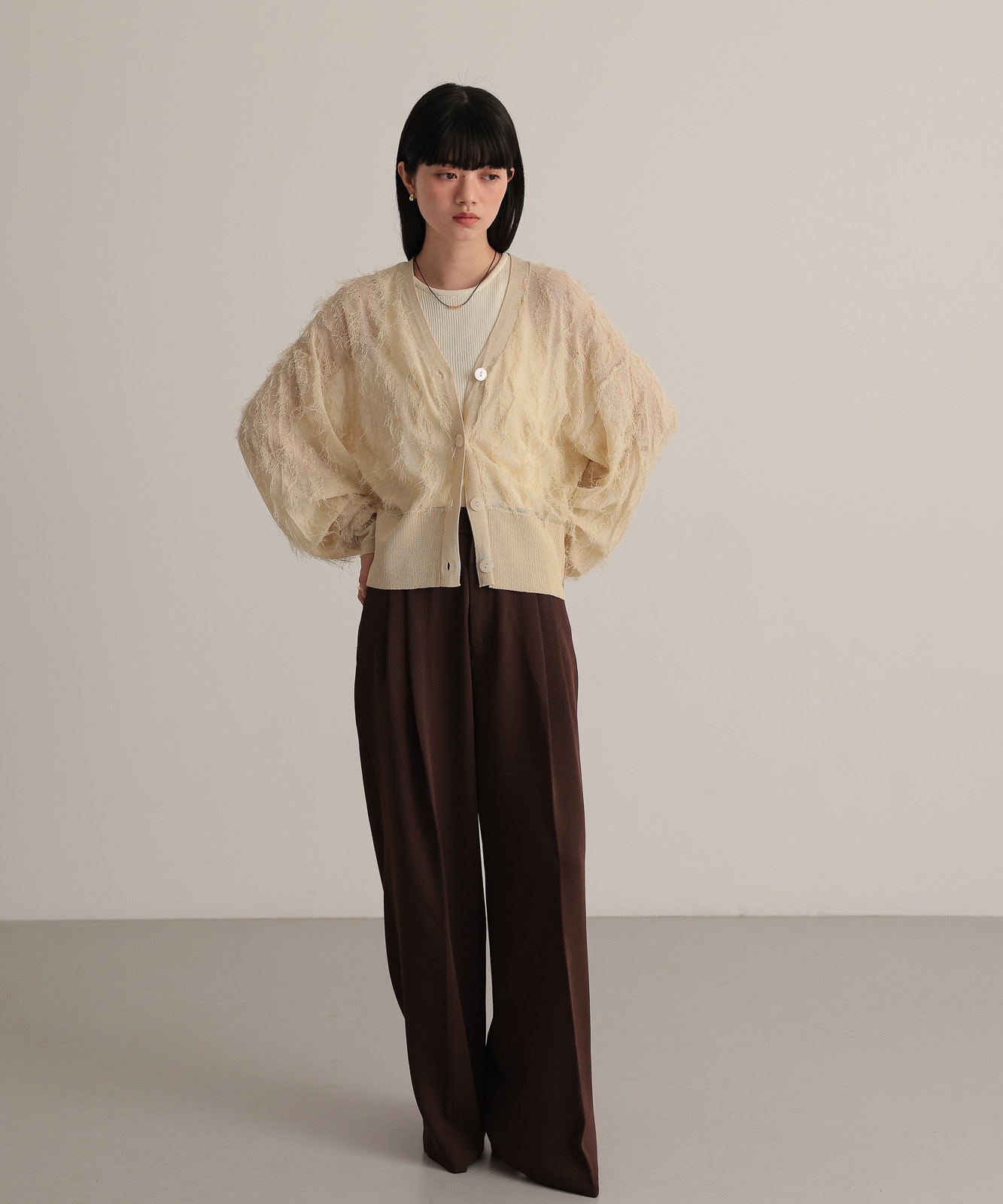 繊細な糸で編んだフリンジジャガードは程よく透け感あり、軽やかな着心地です。
