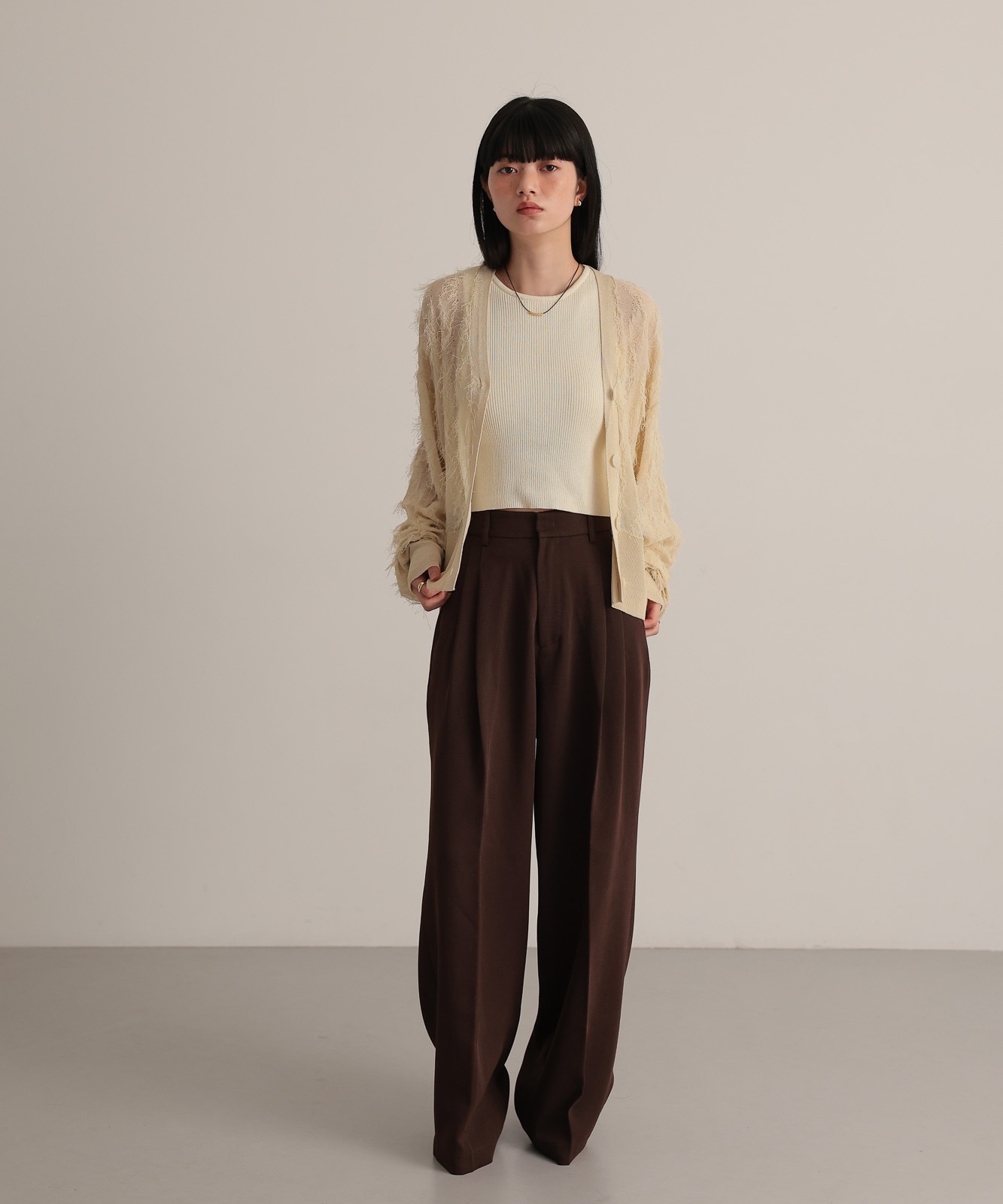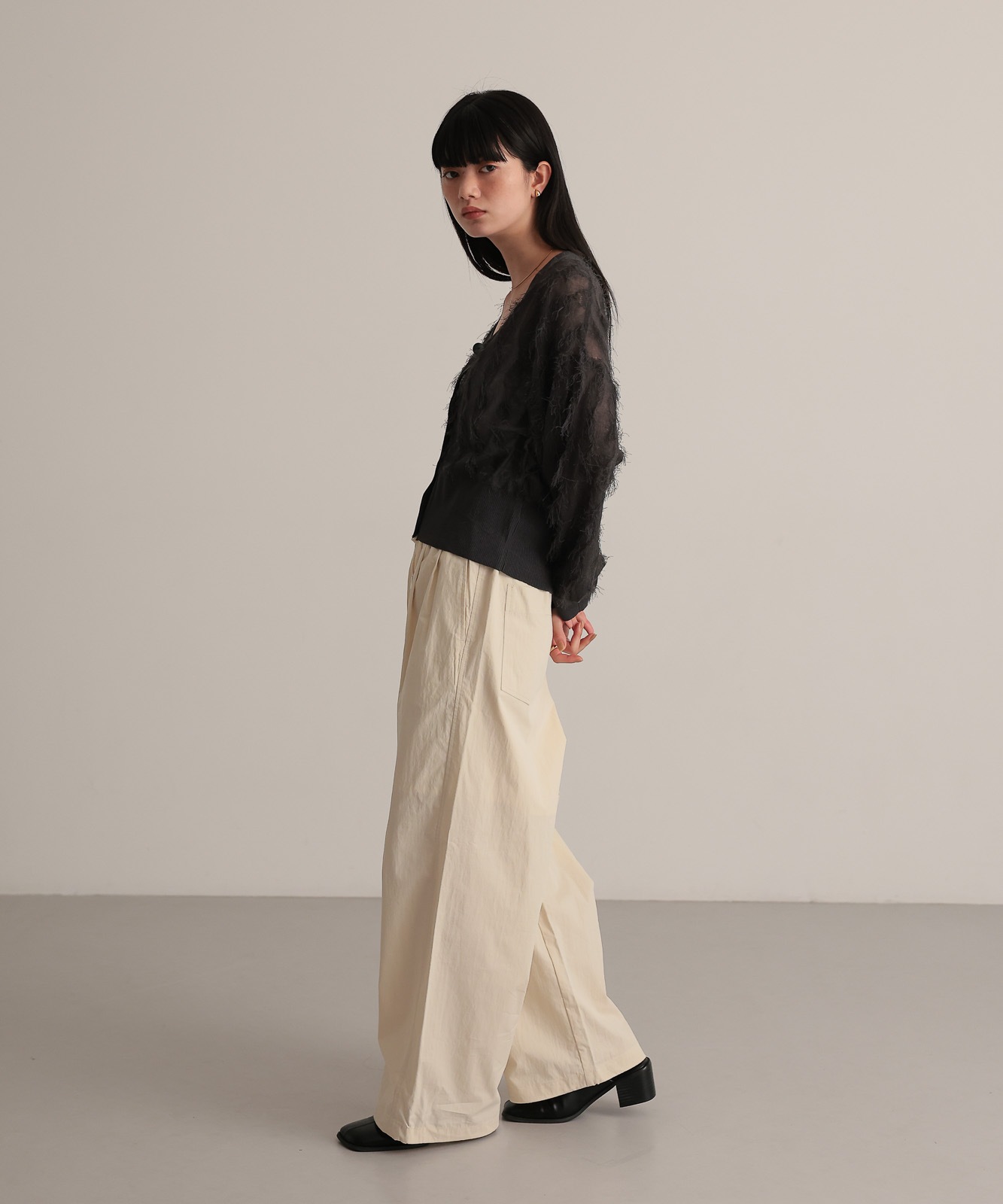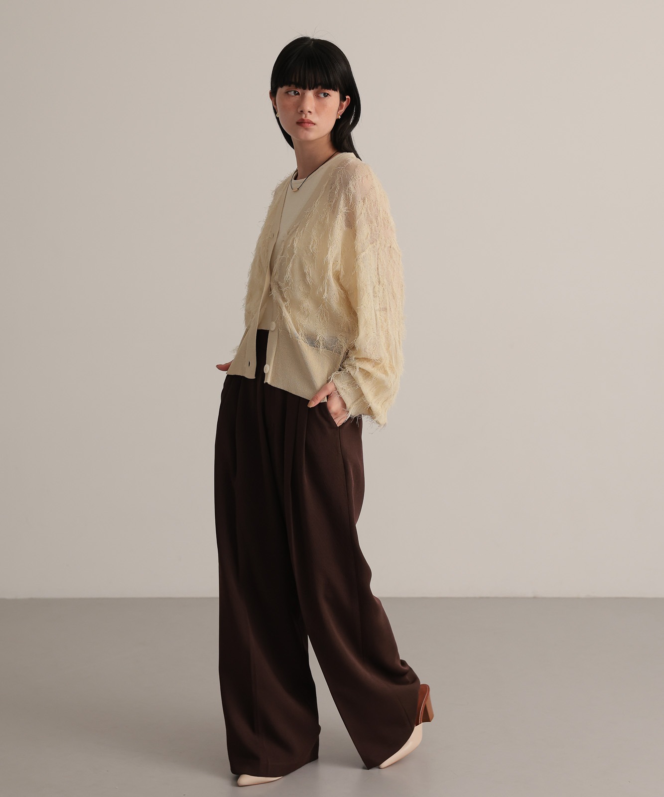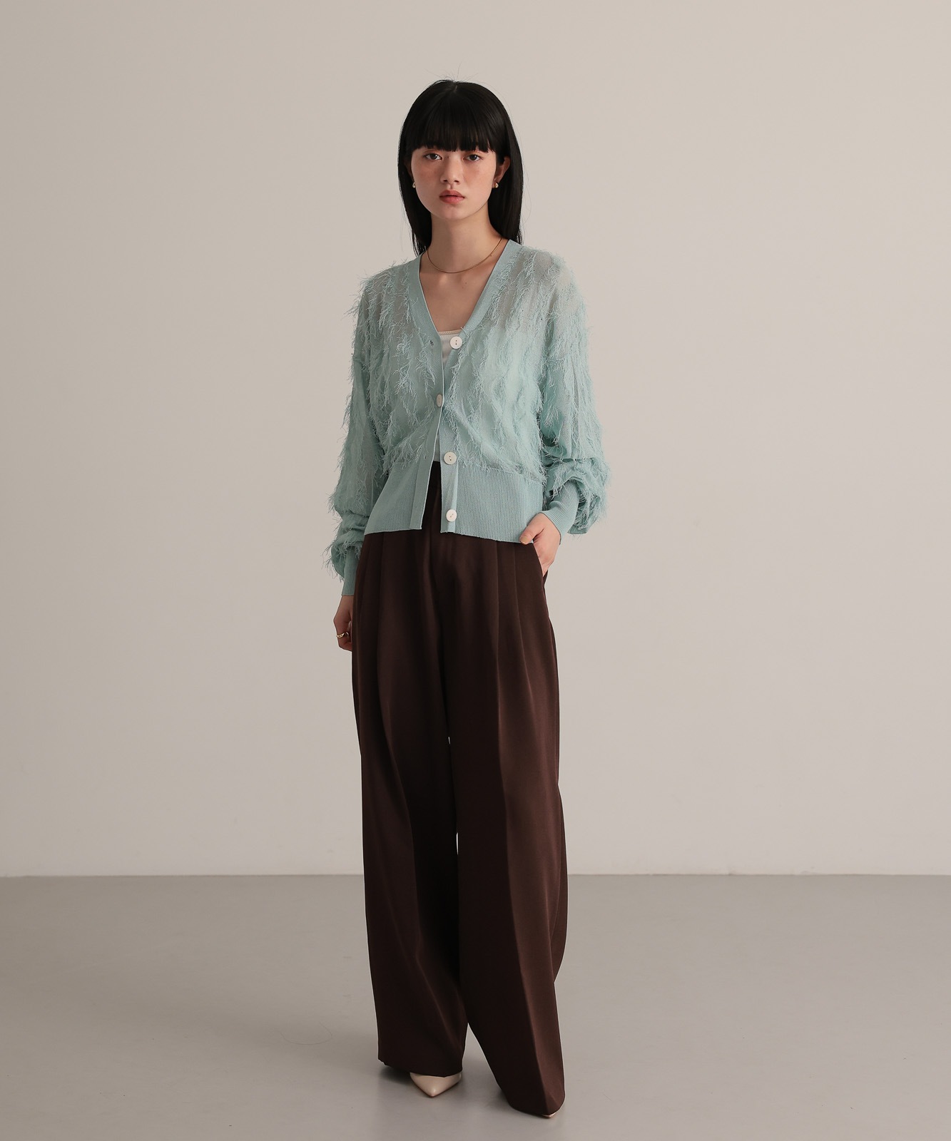 繊細な糸で編んだフリンジジャガードは程よく透け感あり、軽やかな着心地です。