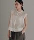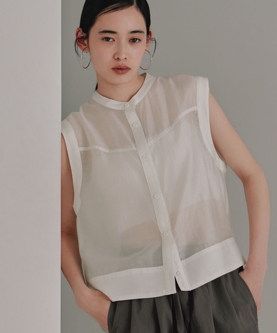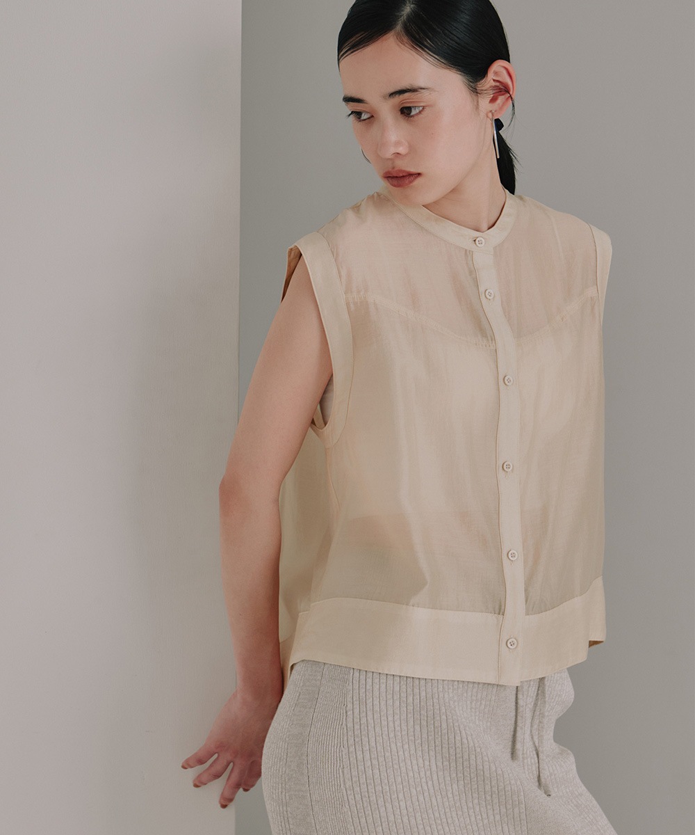 後ろにタックフレアが入った立体的なシルエットが特徴のノースリーブシャツ