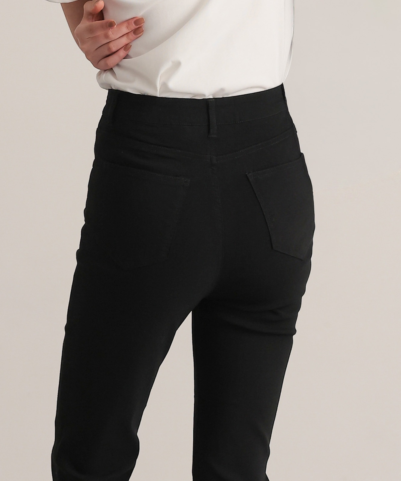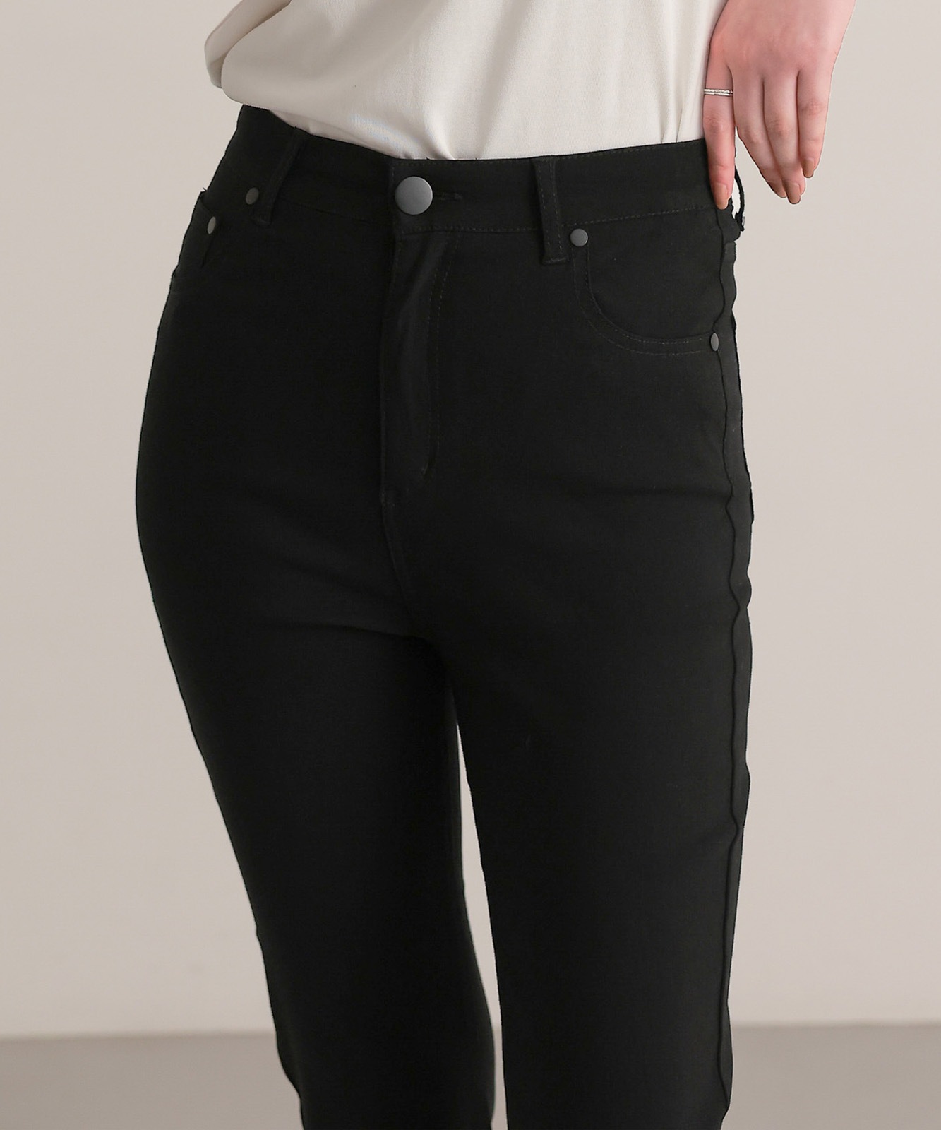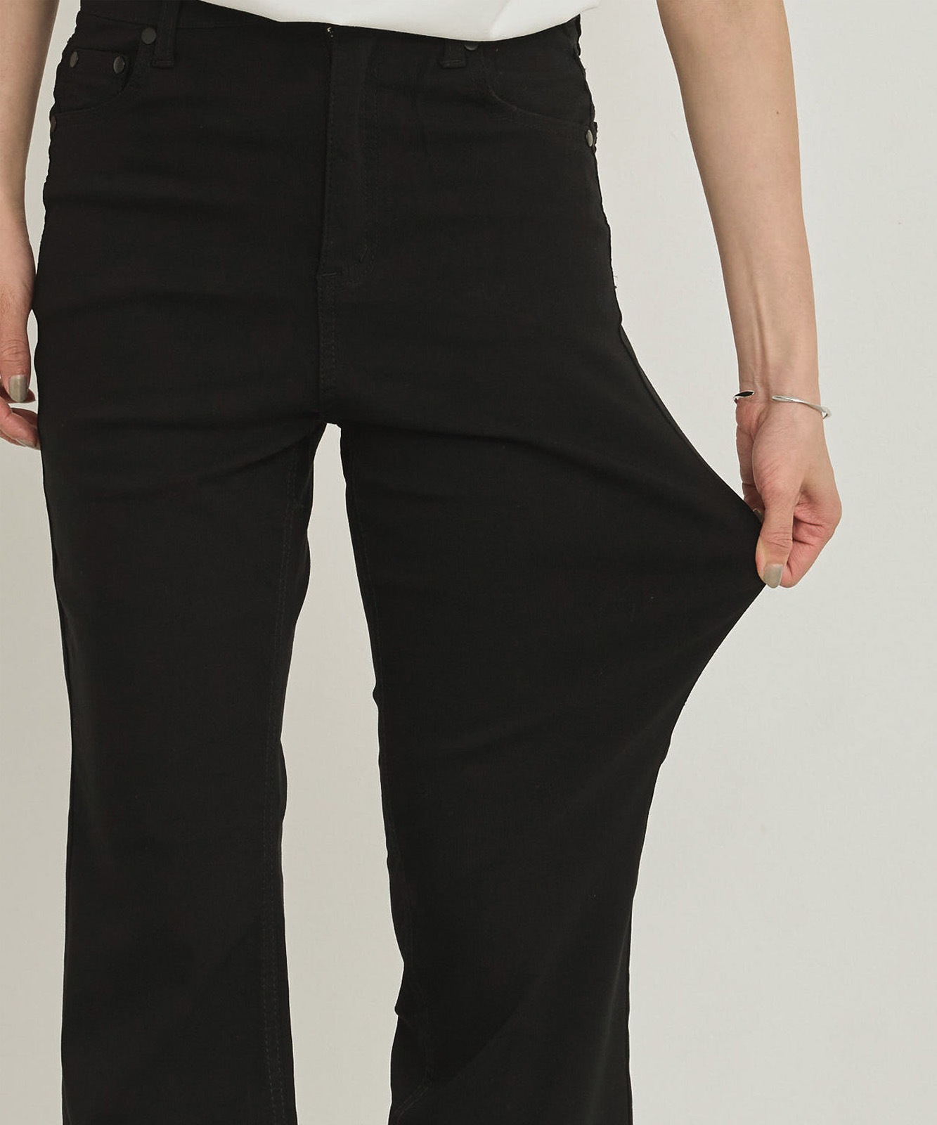 脚長効果のあるハイウエストデザインで、伸縮性抜群のストレッチ生地のため快適な履き心地。