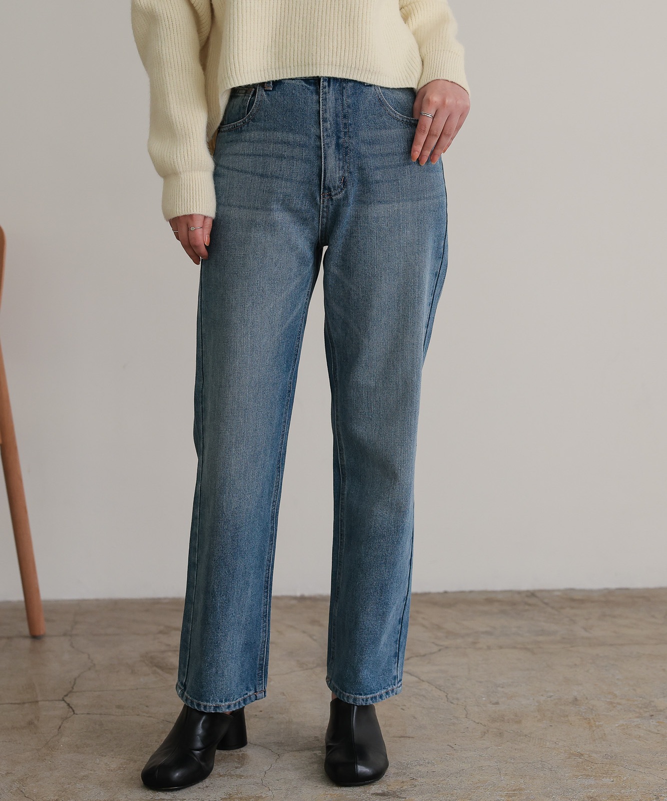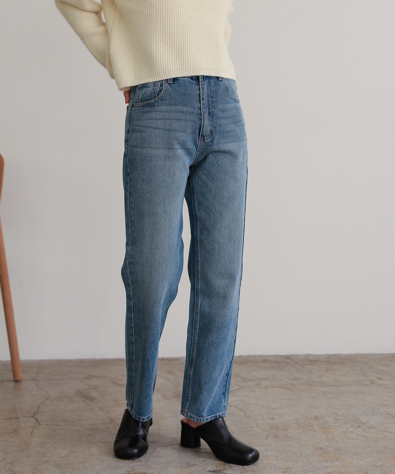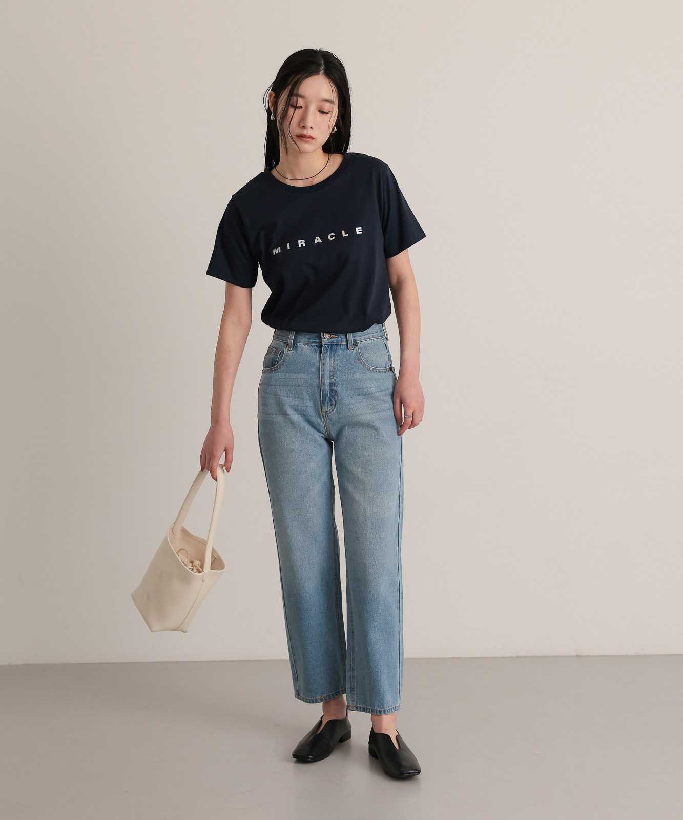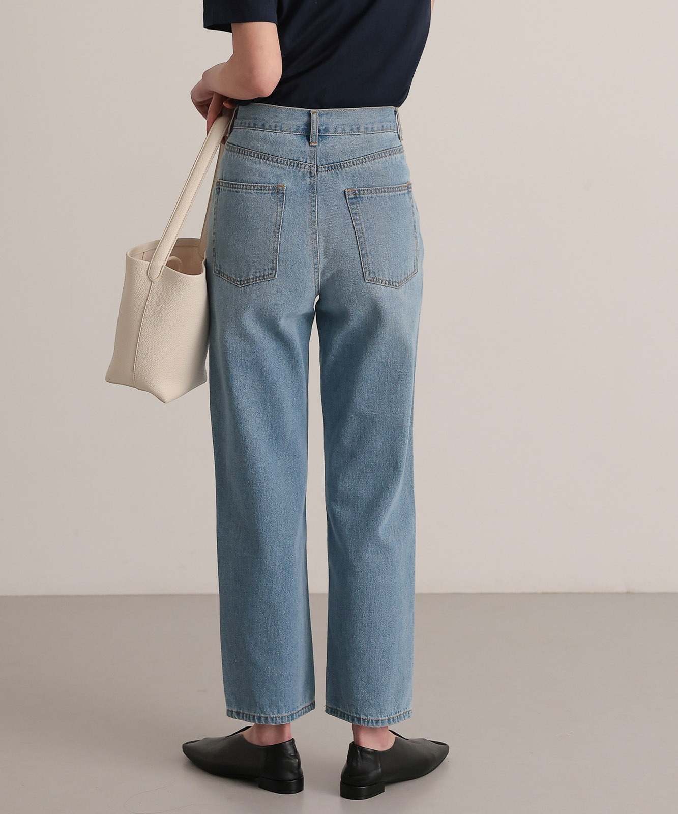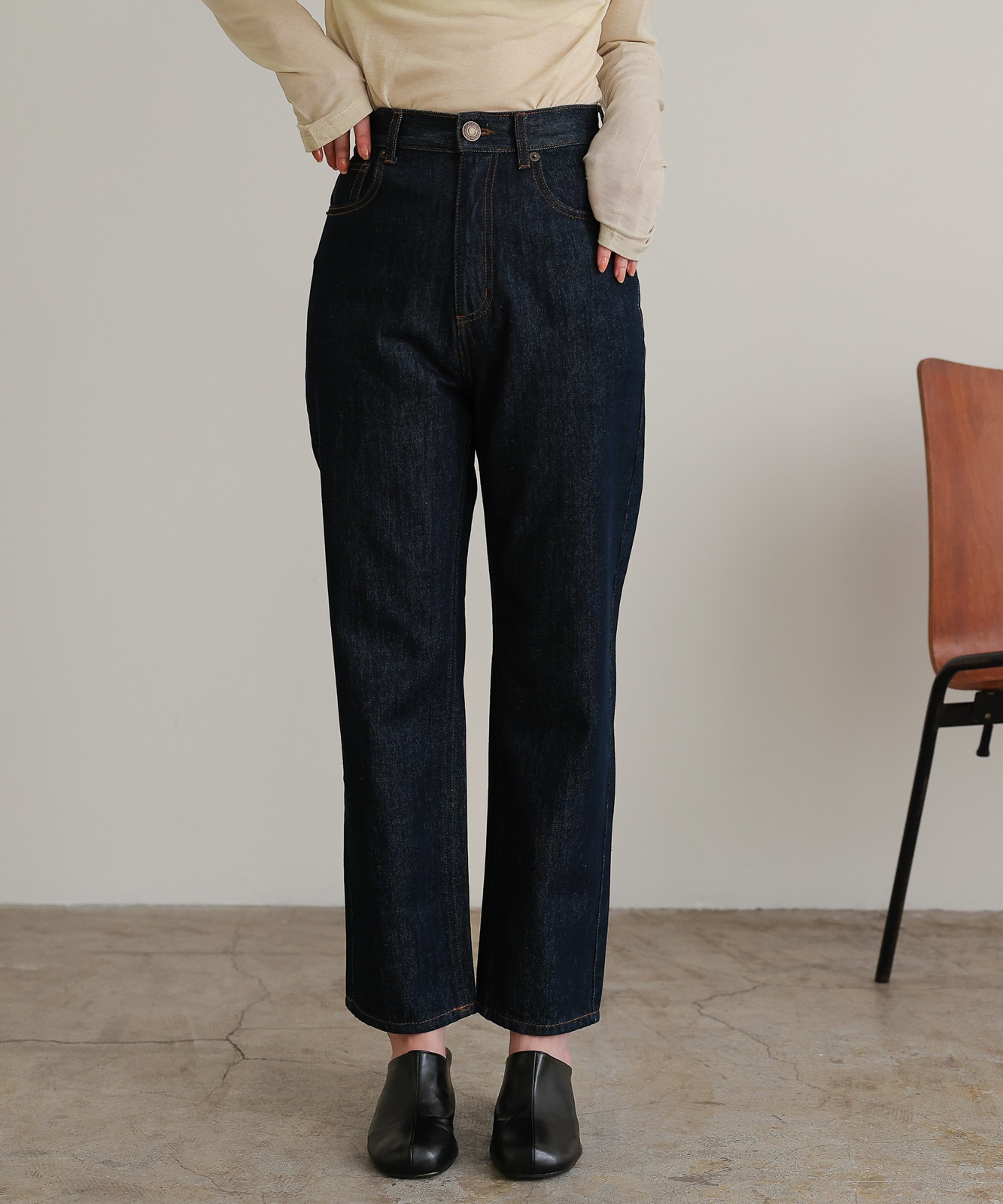 程よくゆとりのあるストレートデニムはスタイスアップ効果はもちろん、華奢見せ効果も◎