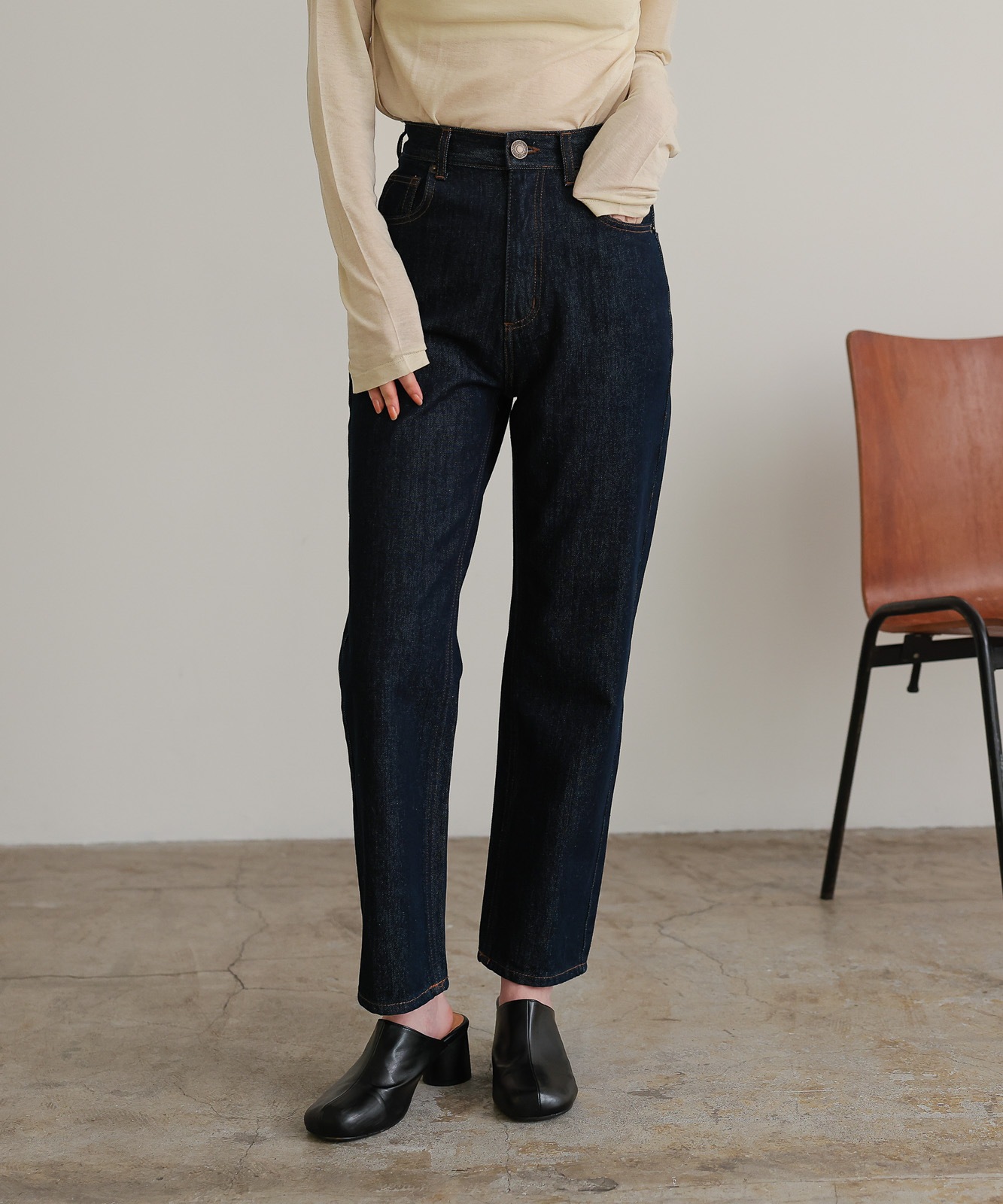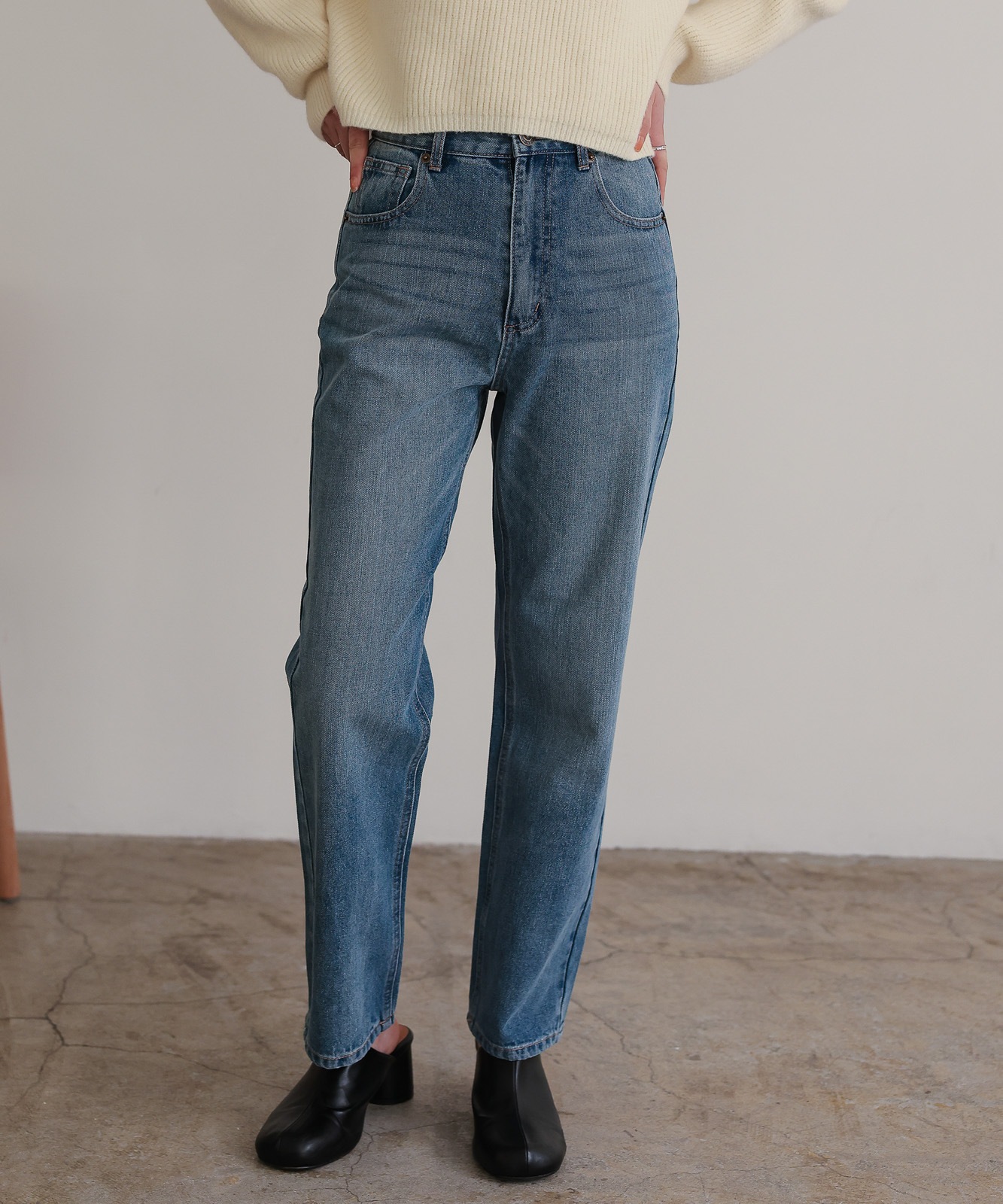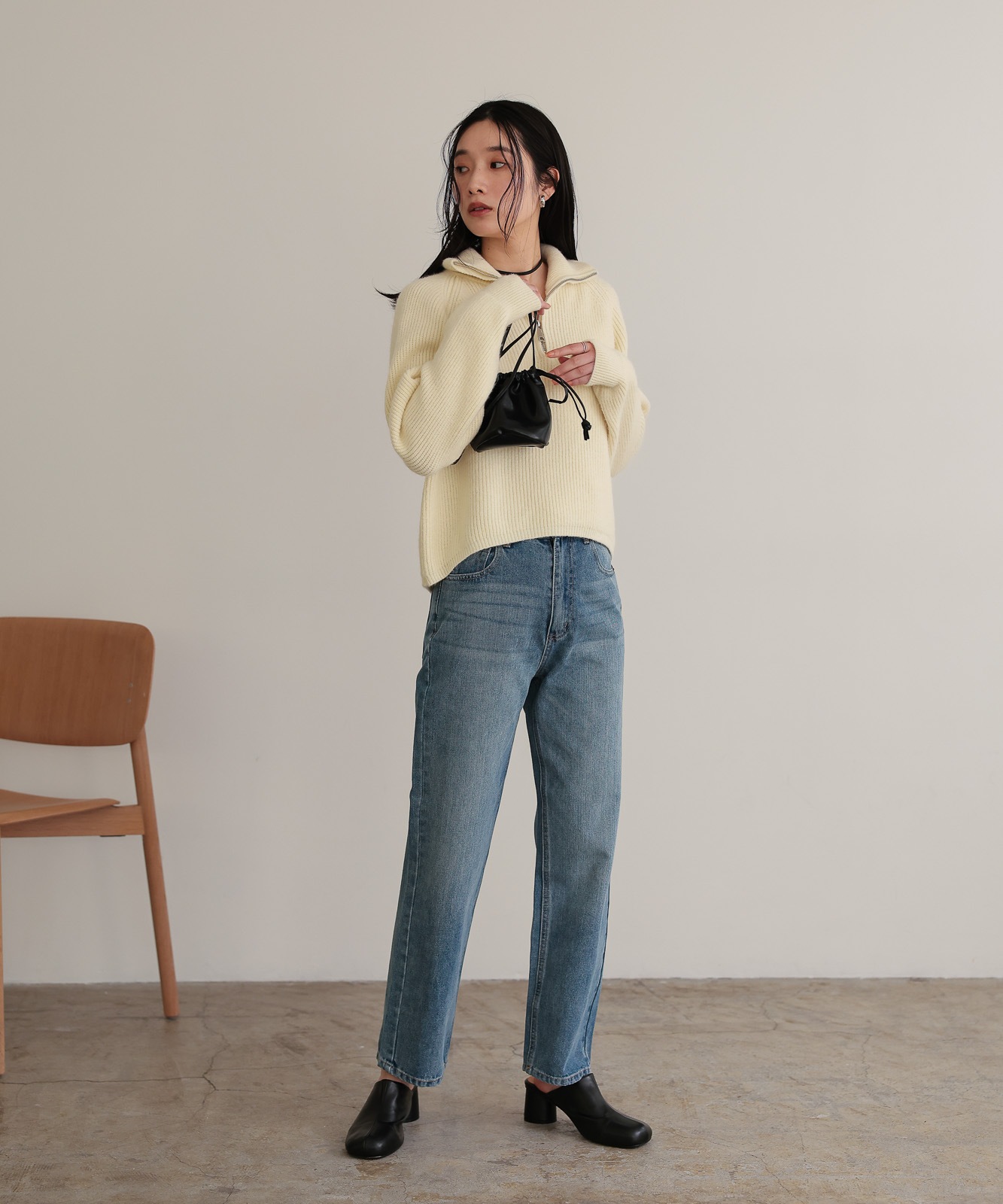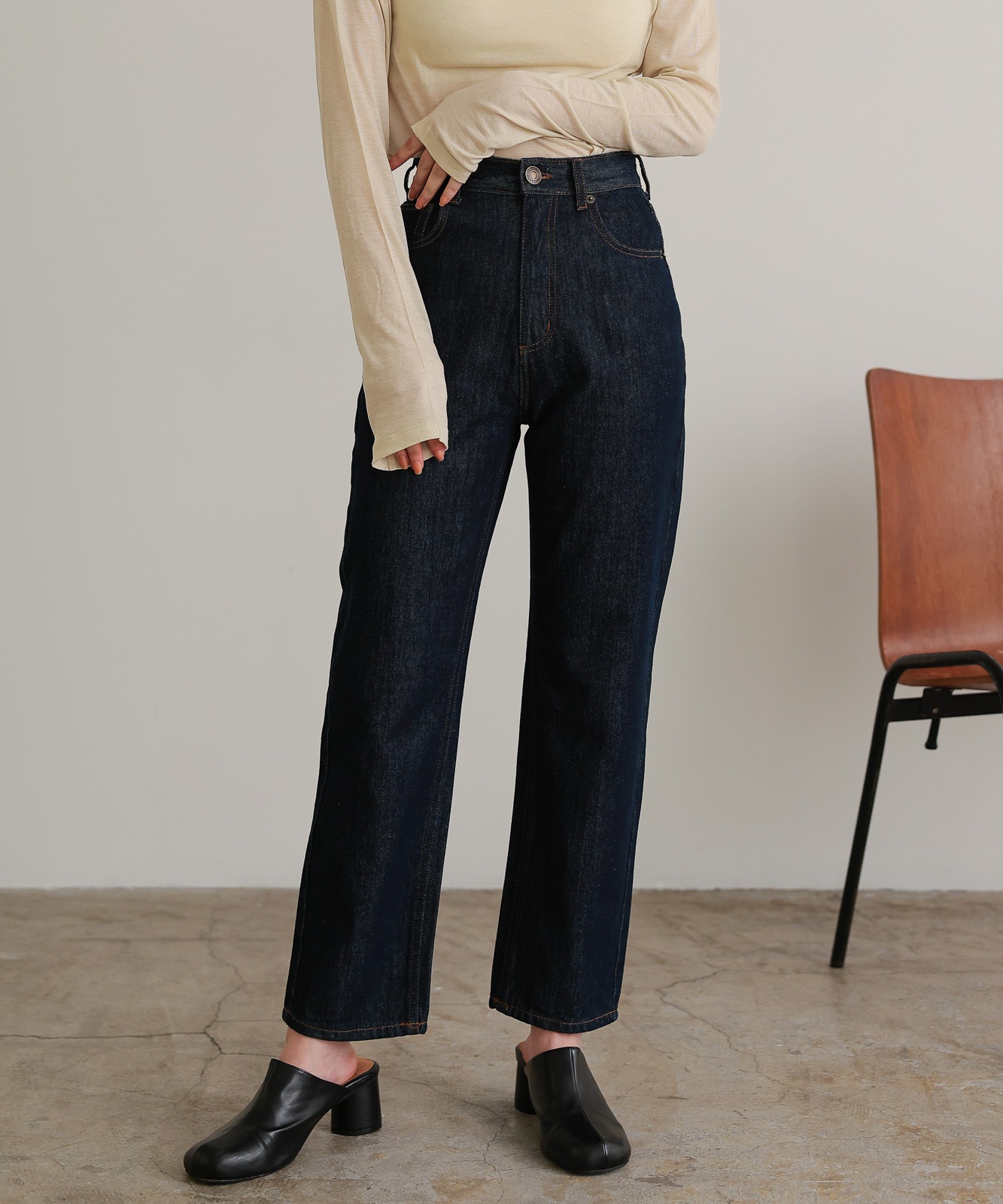 程よくゆとりのあるストレートデニムはスタイスアップ効果はもちろん、華奢見せ効果も◎