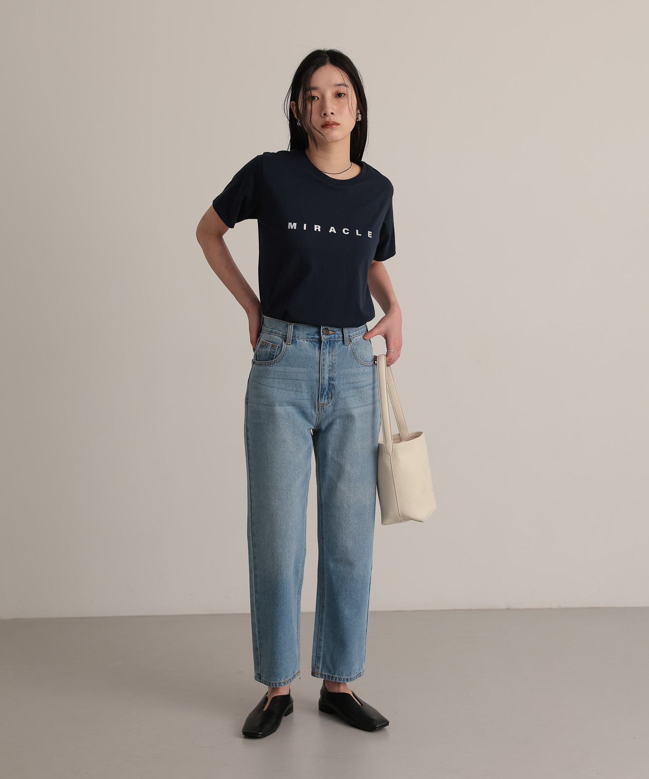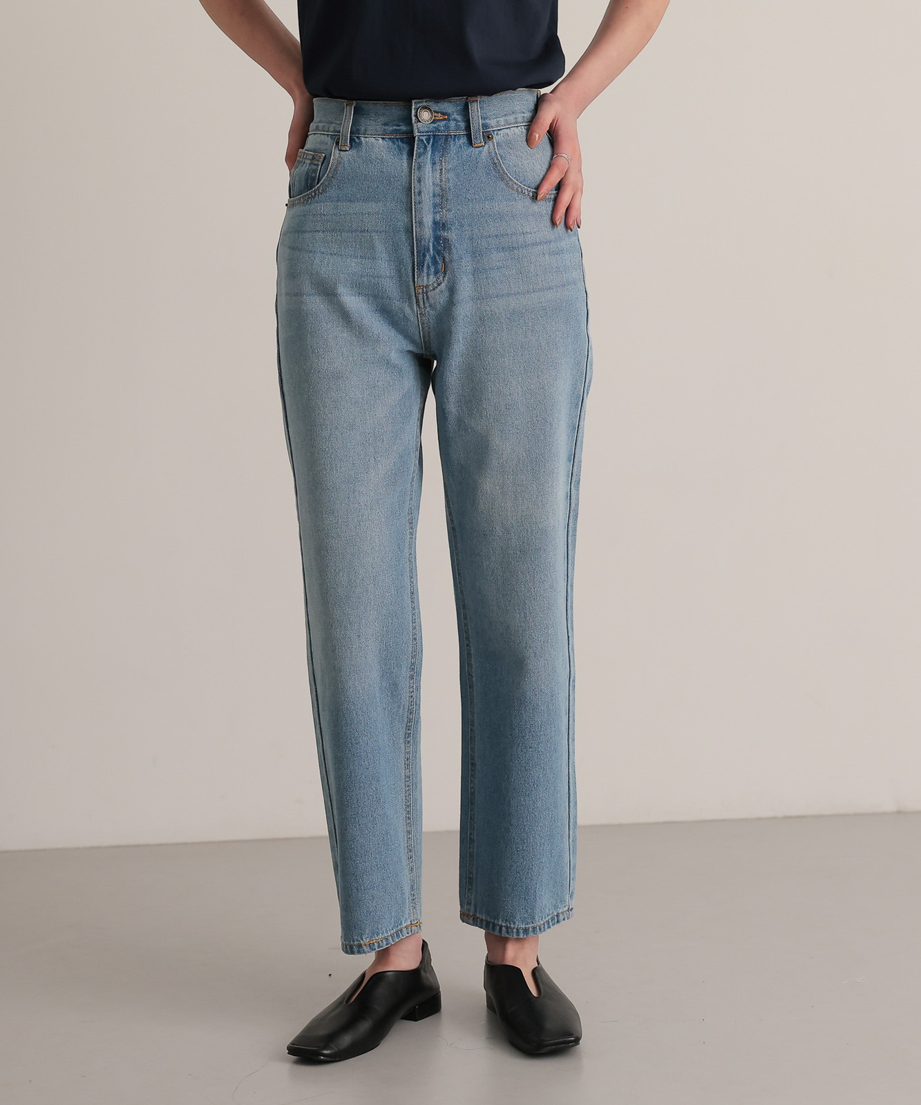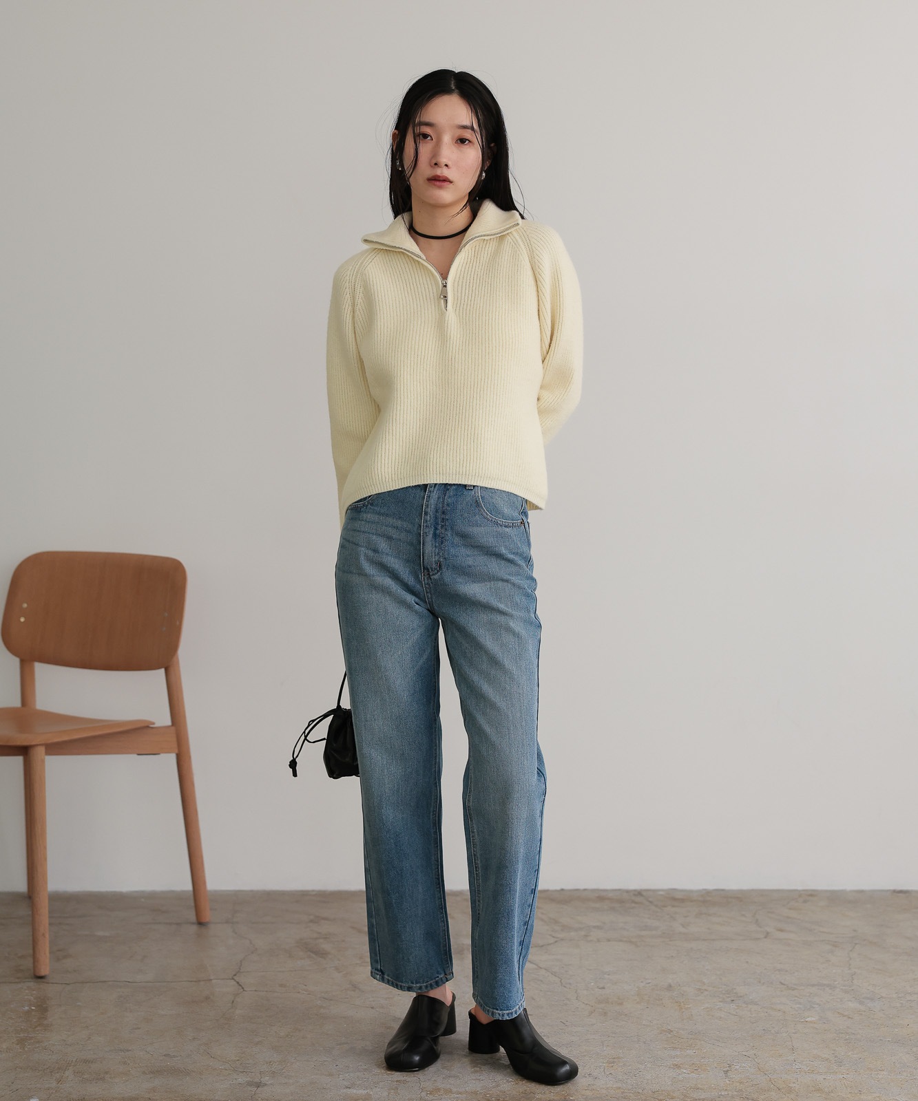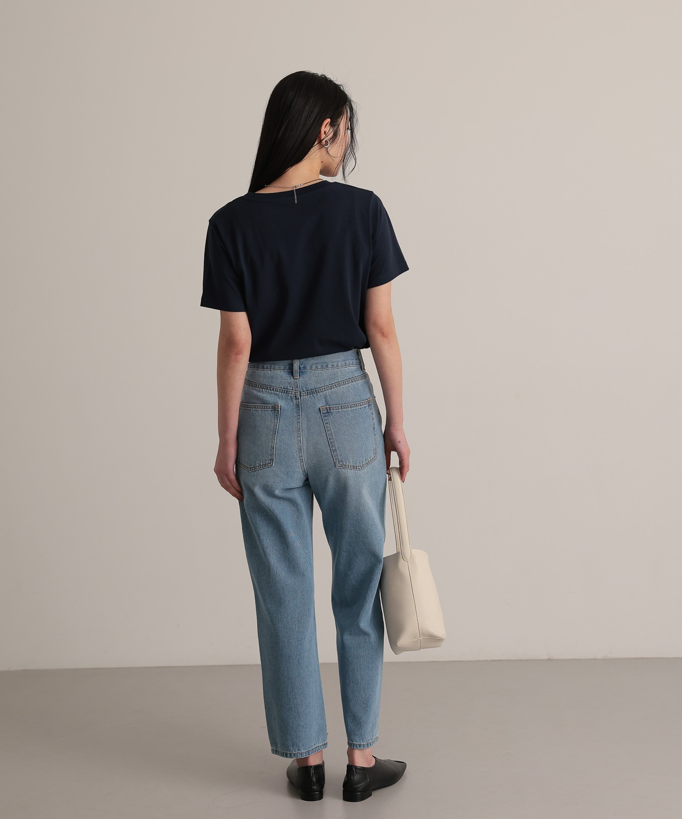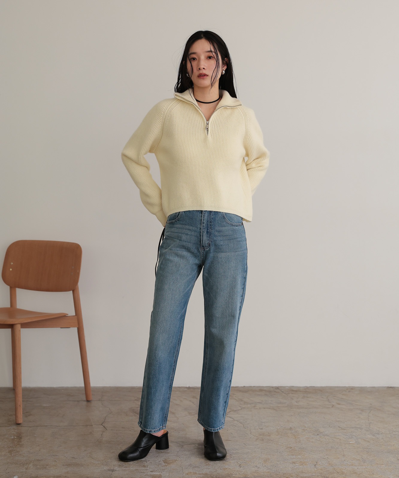 程よくゆとりのあるストレートデニムはスタイスアップ効果はもちろん、華奢見せ効果も◎