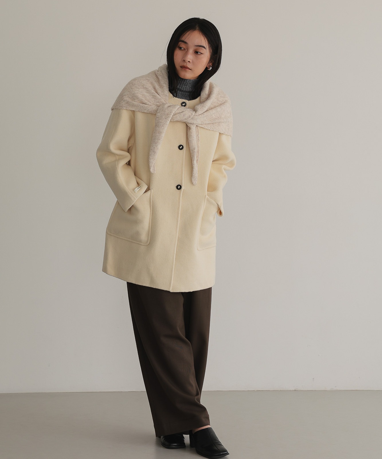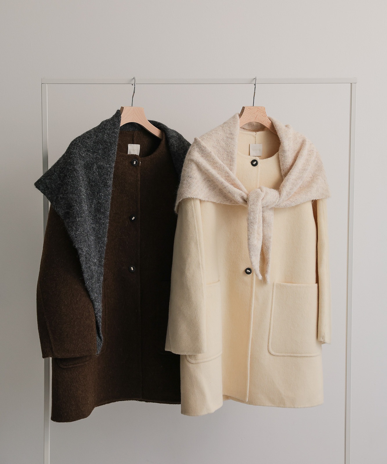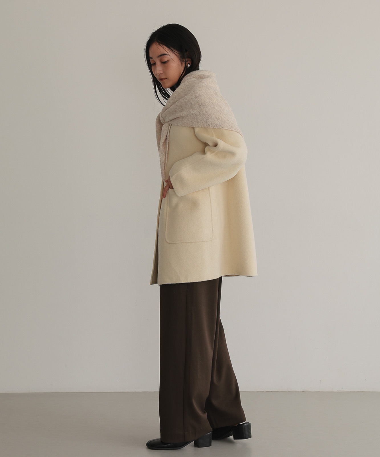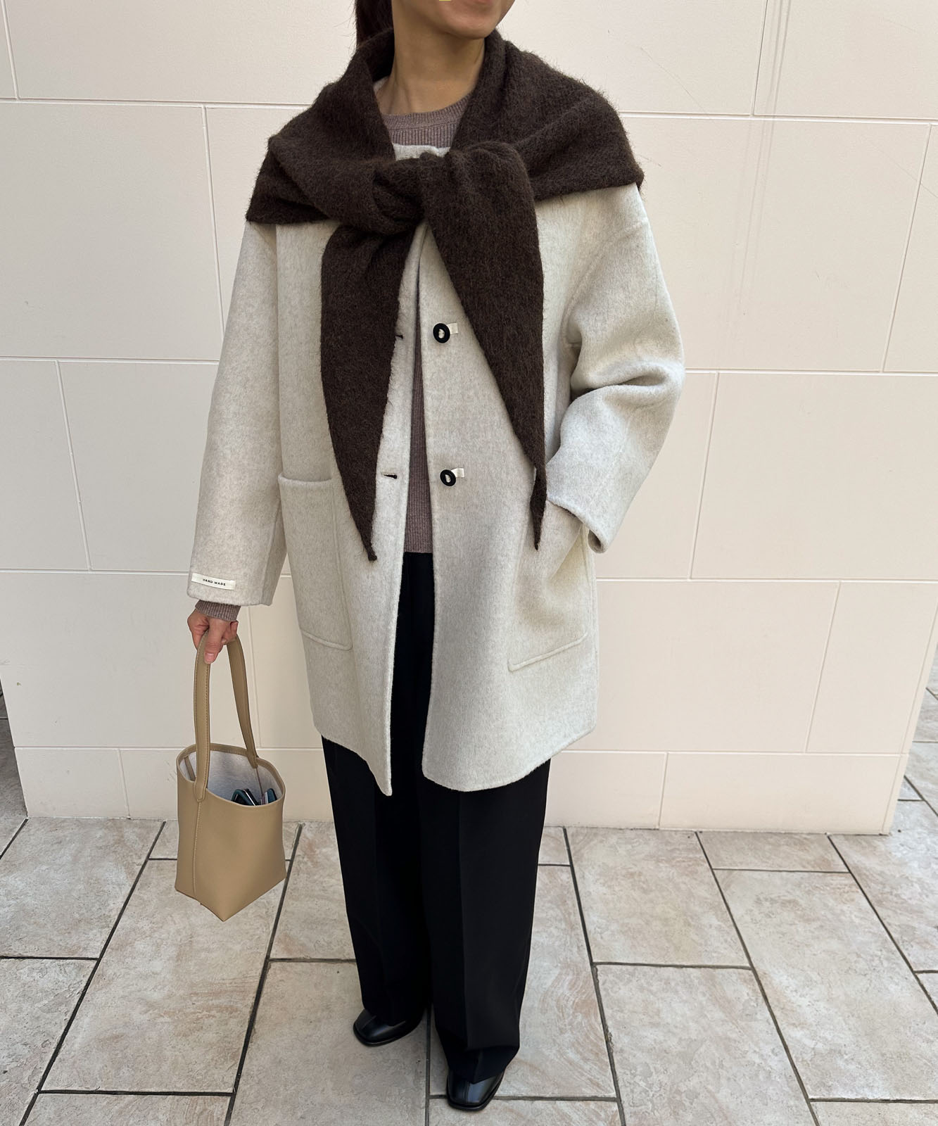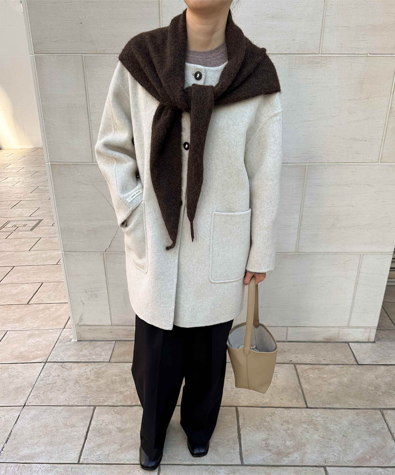 ストール付きコートは、オンオフ兼用のミドル丈で、程よいきちんと感が魅力。