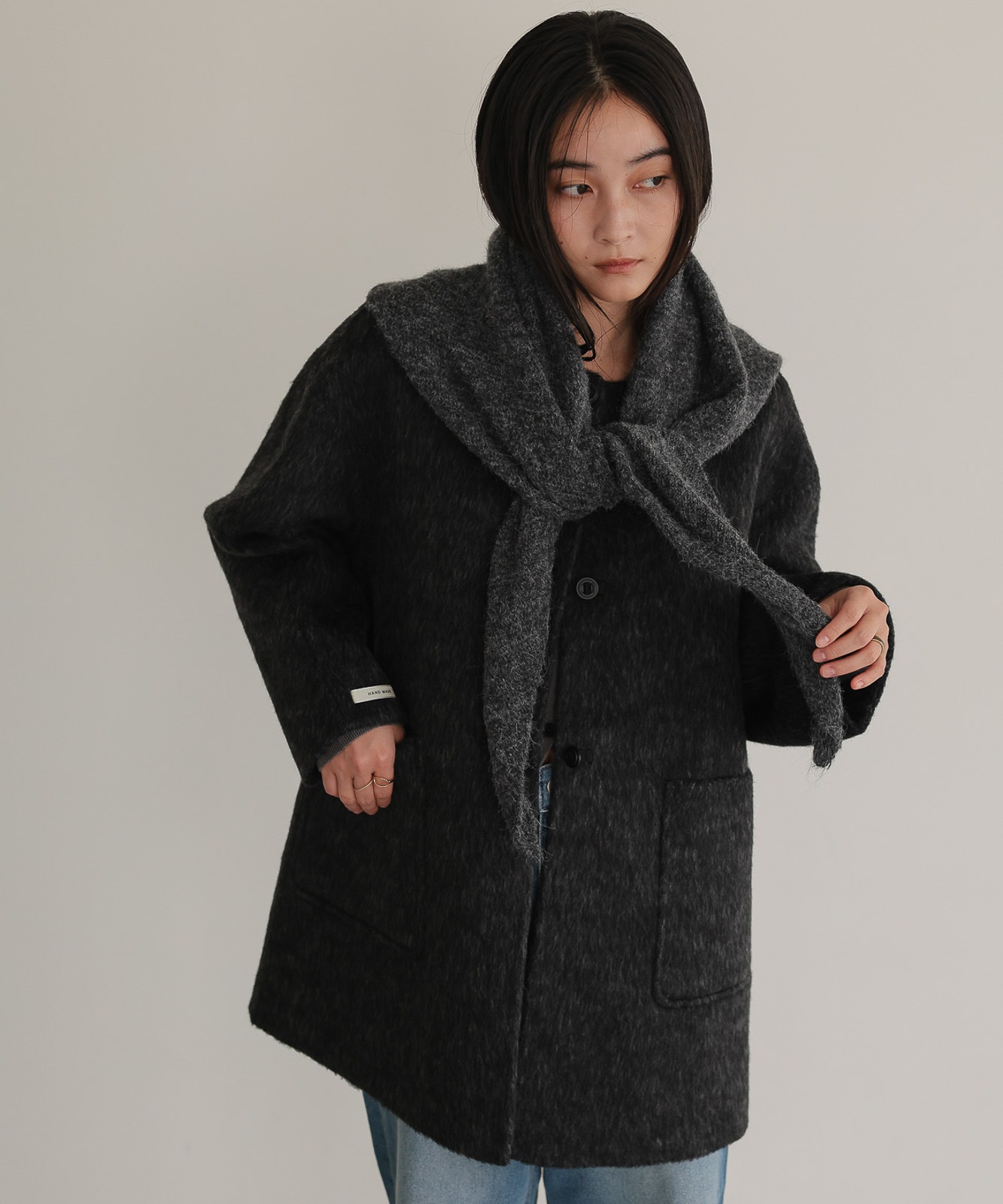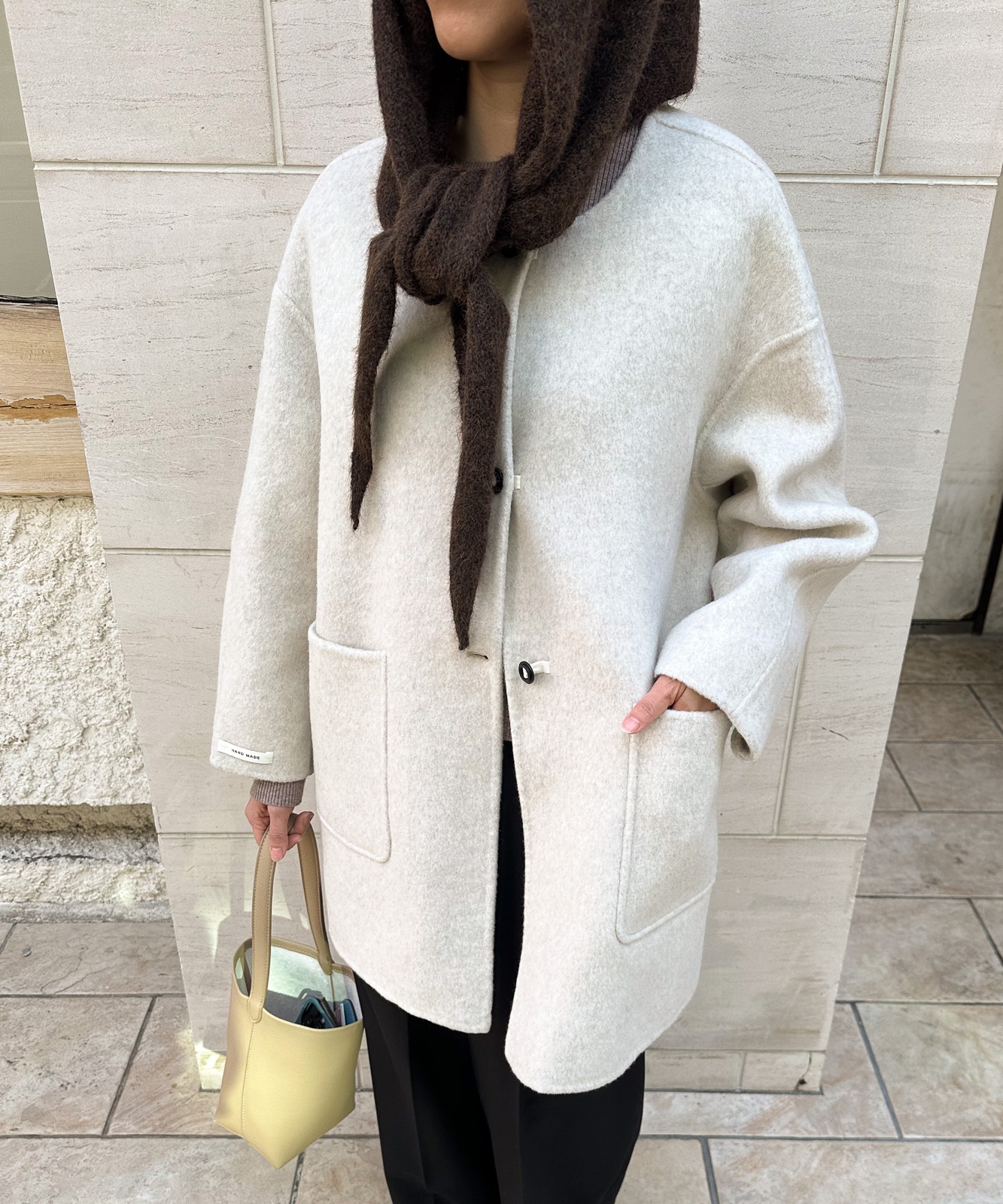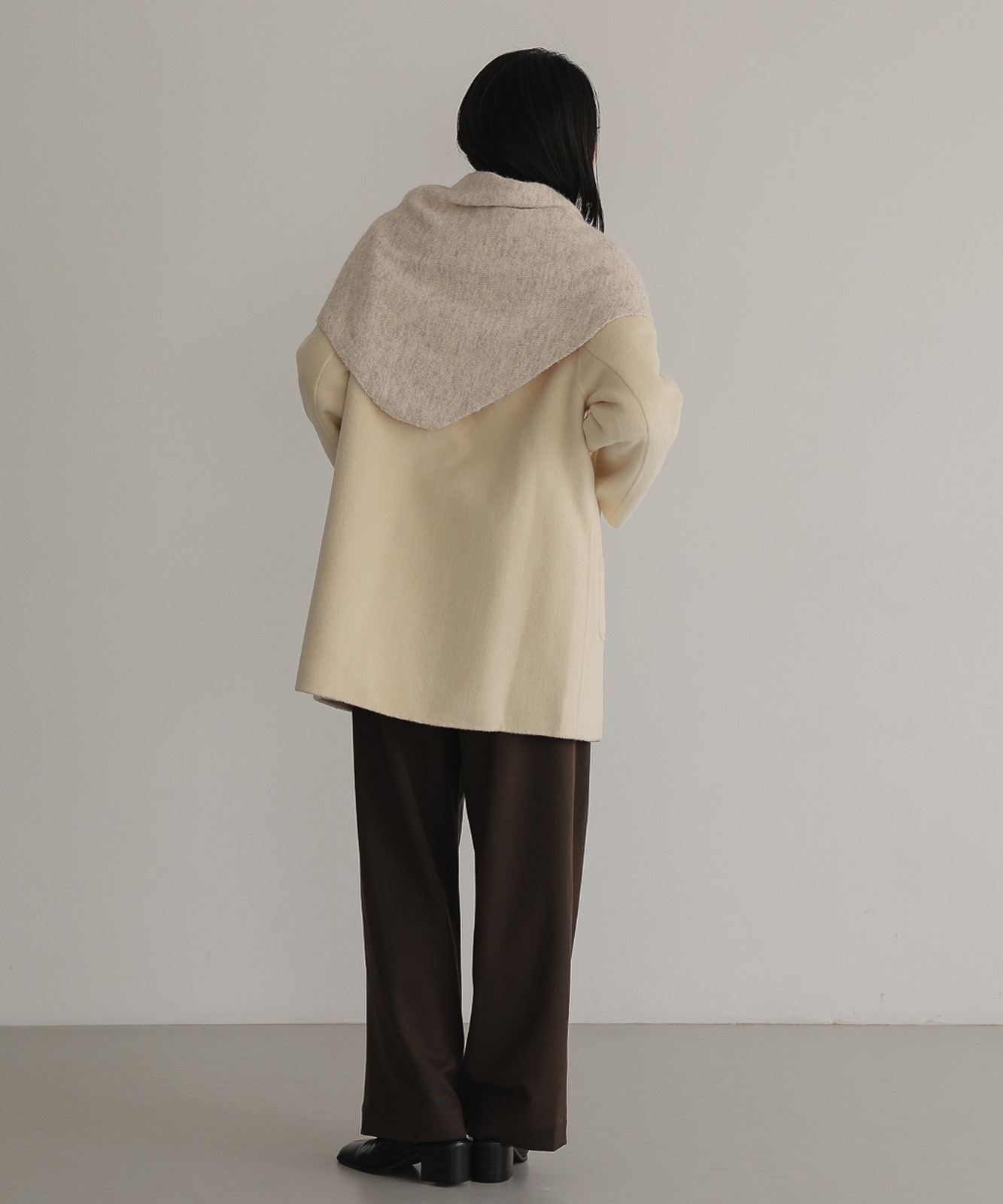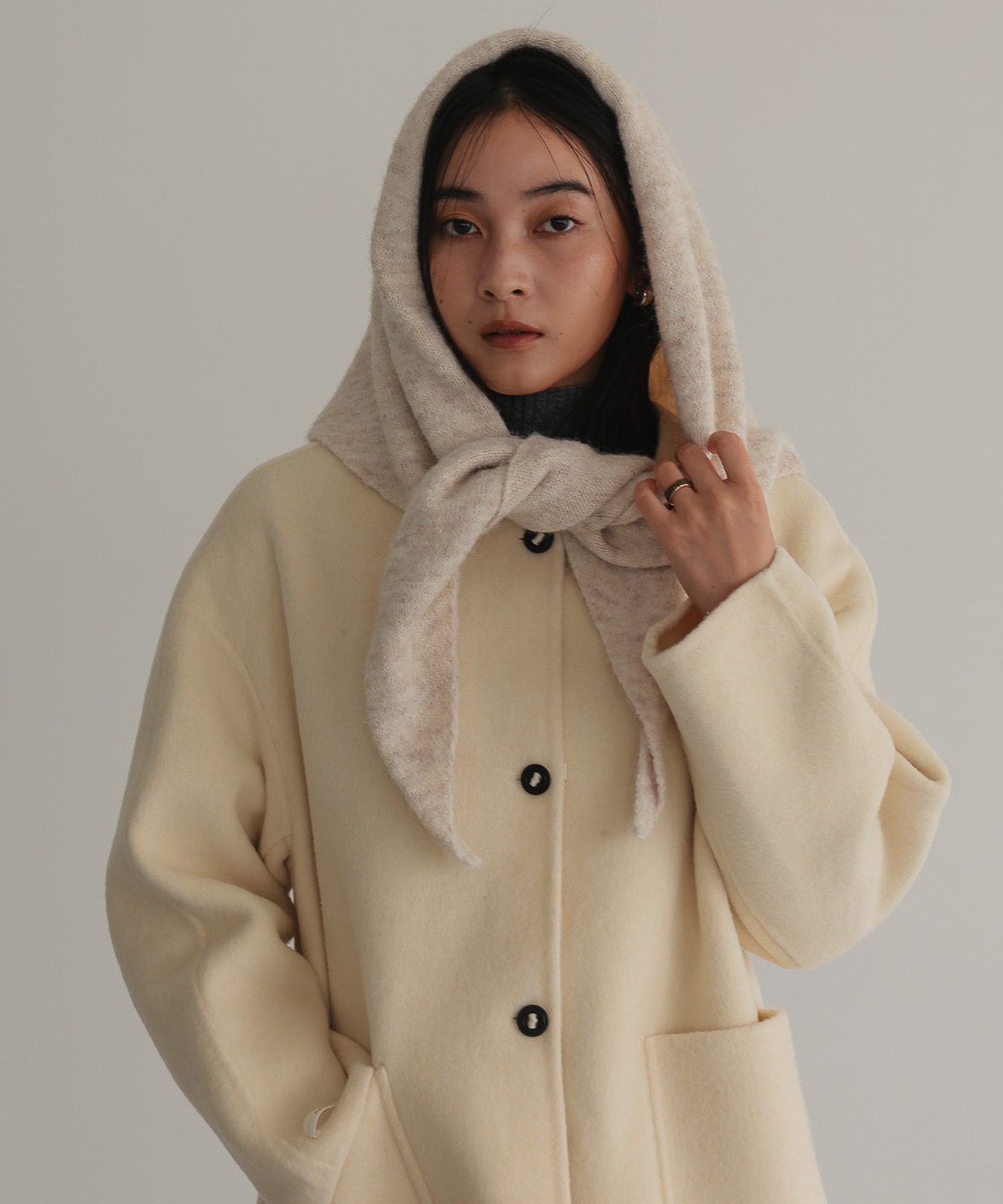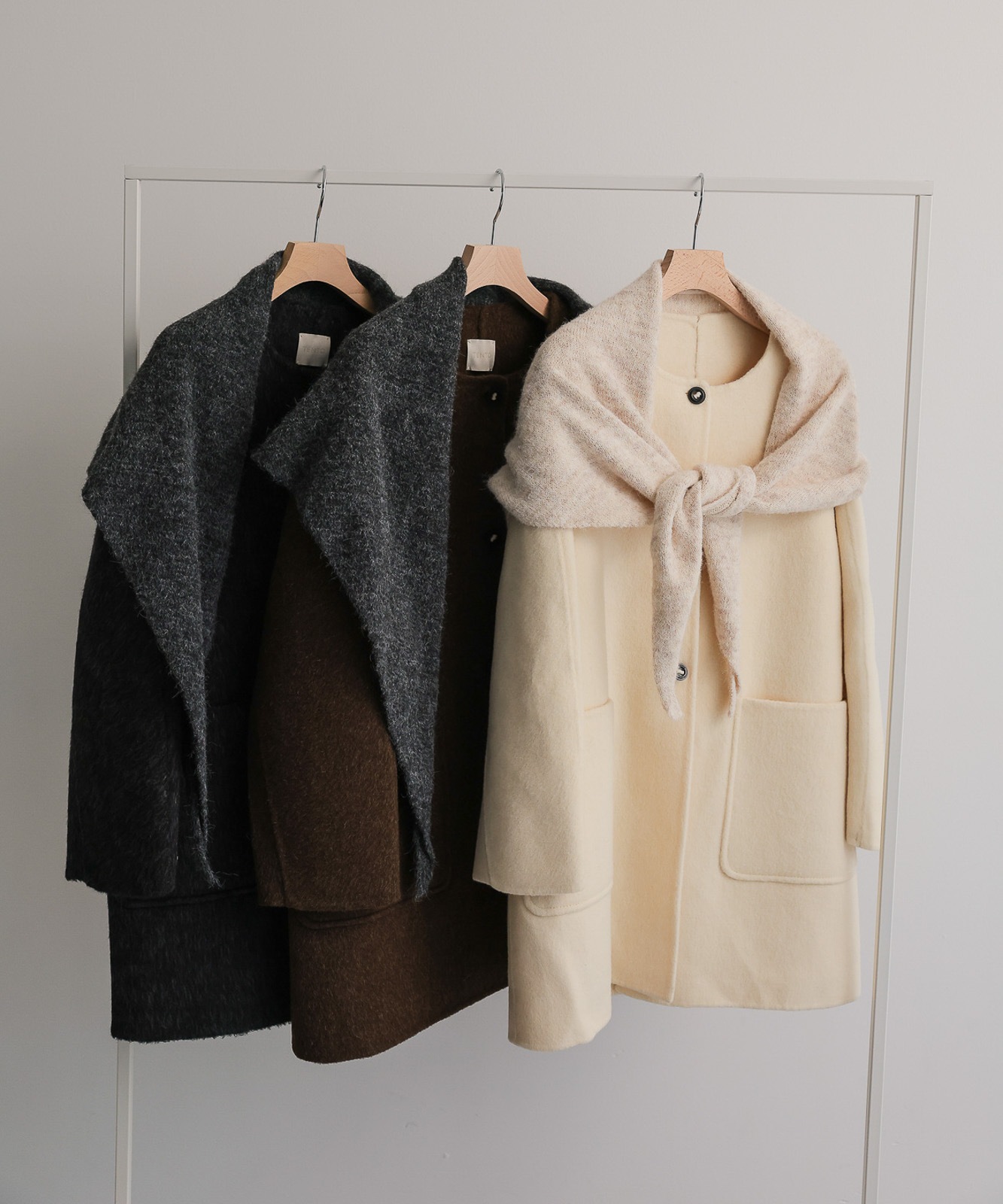 ストール付きコートは、オンオフ兼用のミドル丈で、程よいきちんと感が魅力。