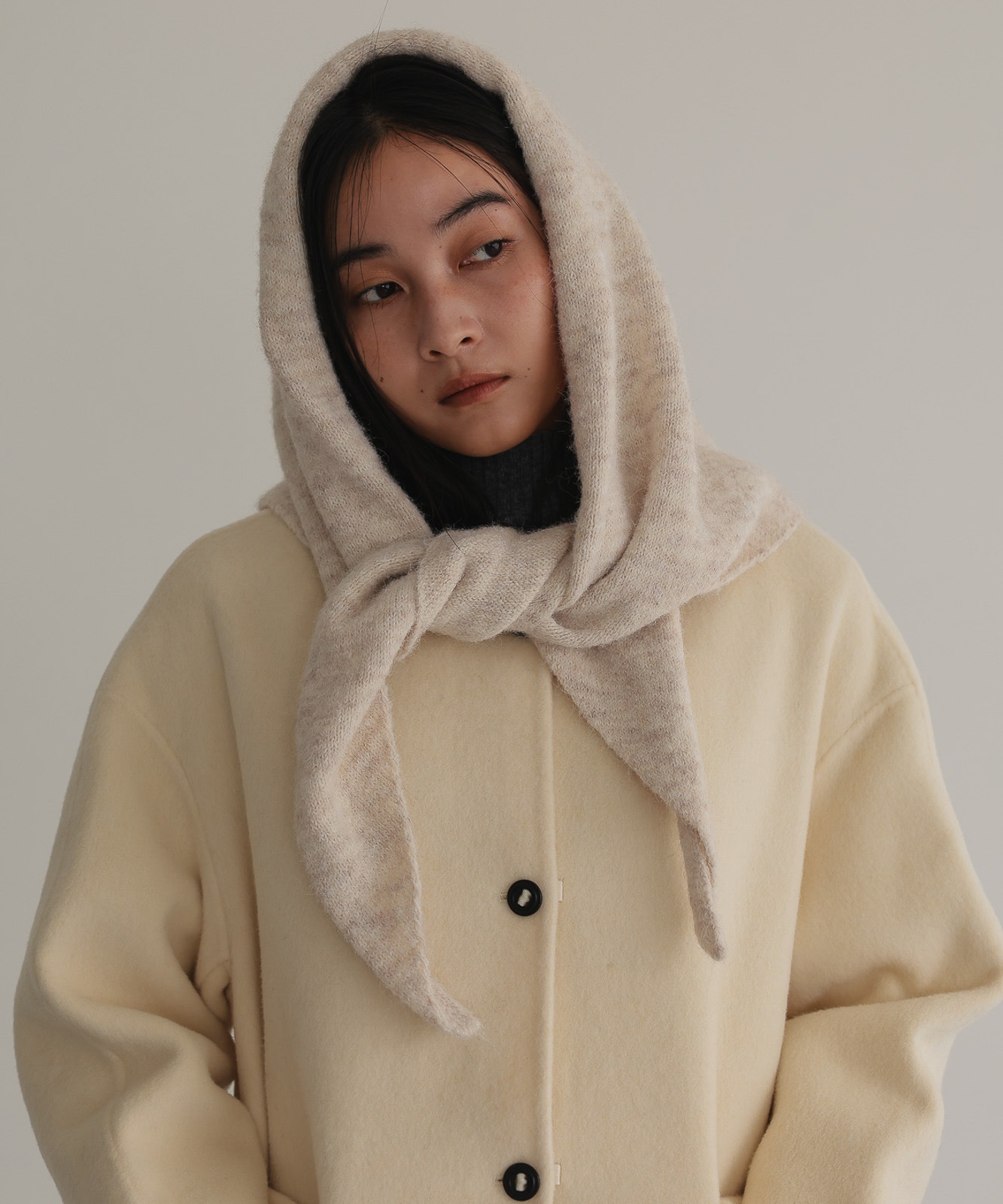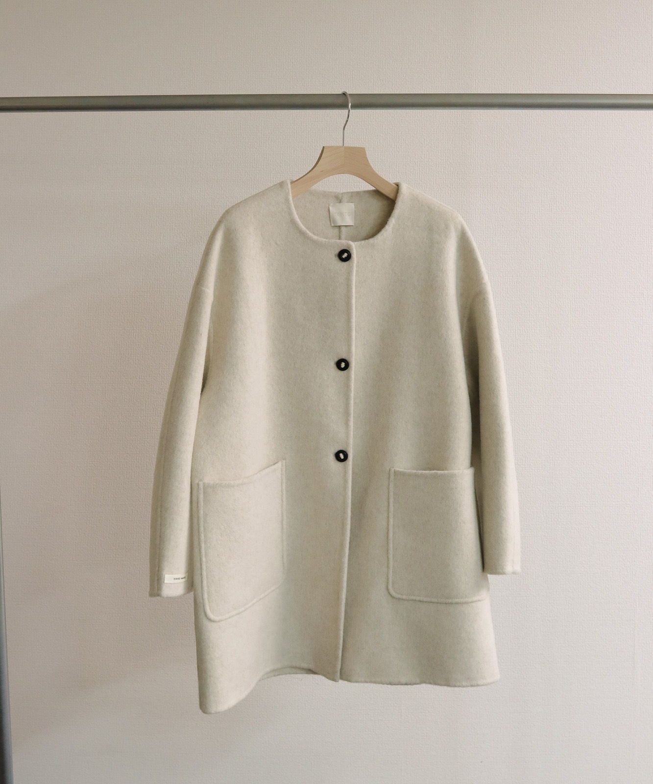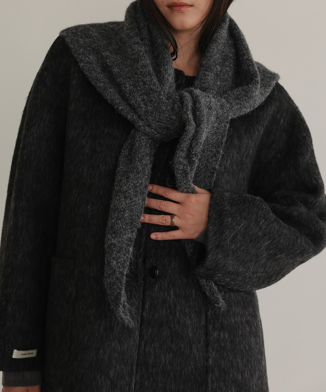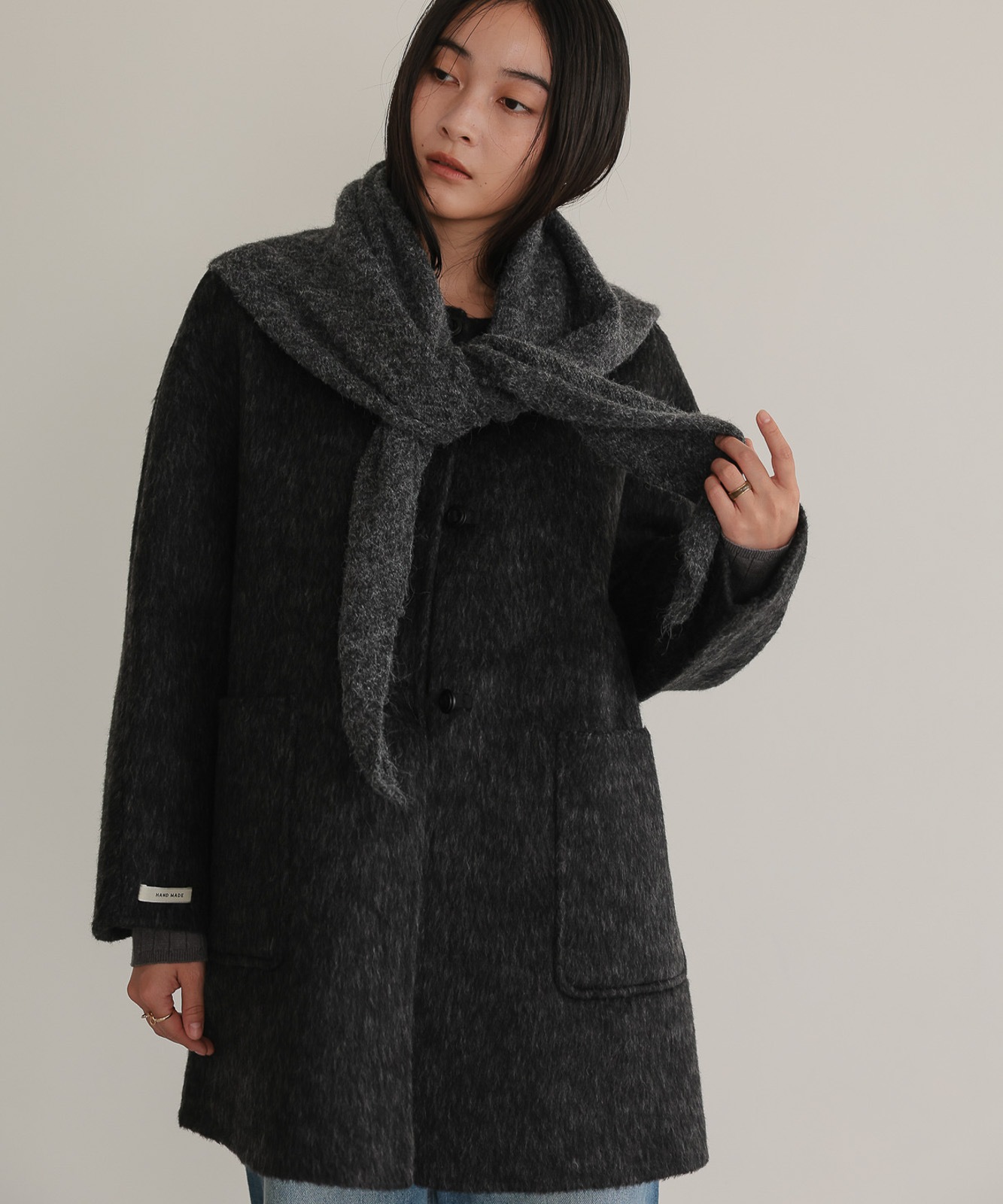 ストール付きコートは、オンオフ兼用のミドル丈で、程よいきちんと感が魅力。