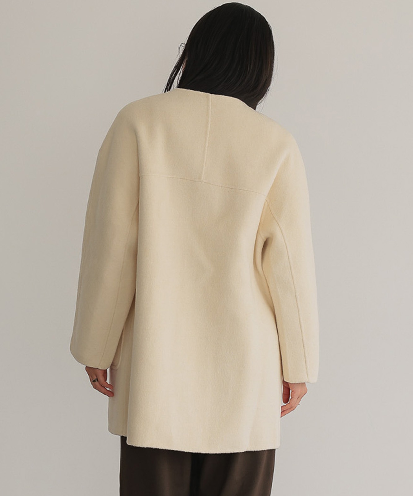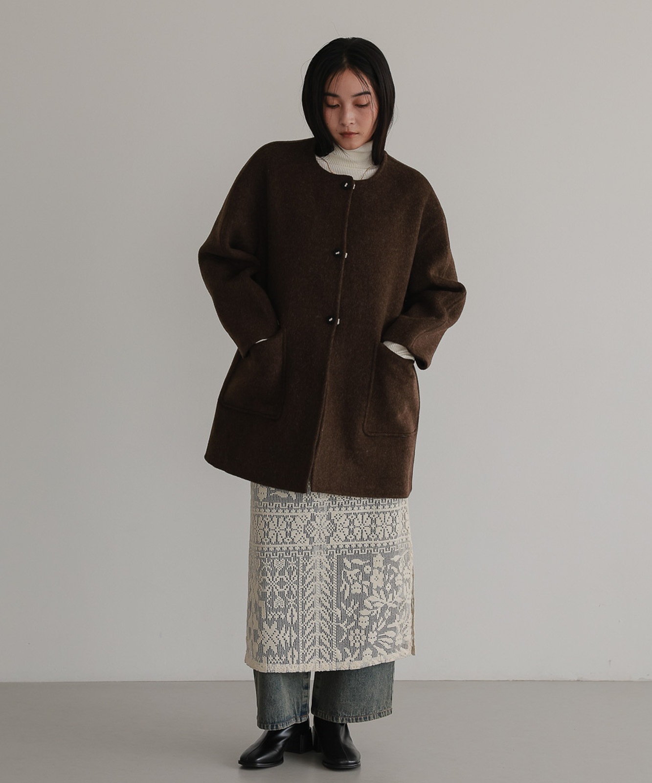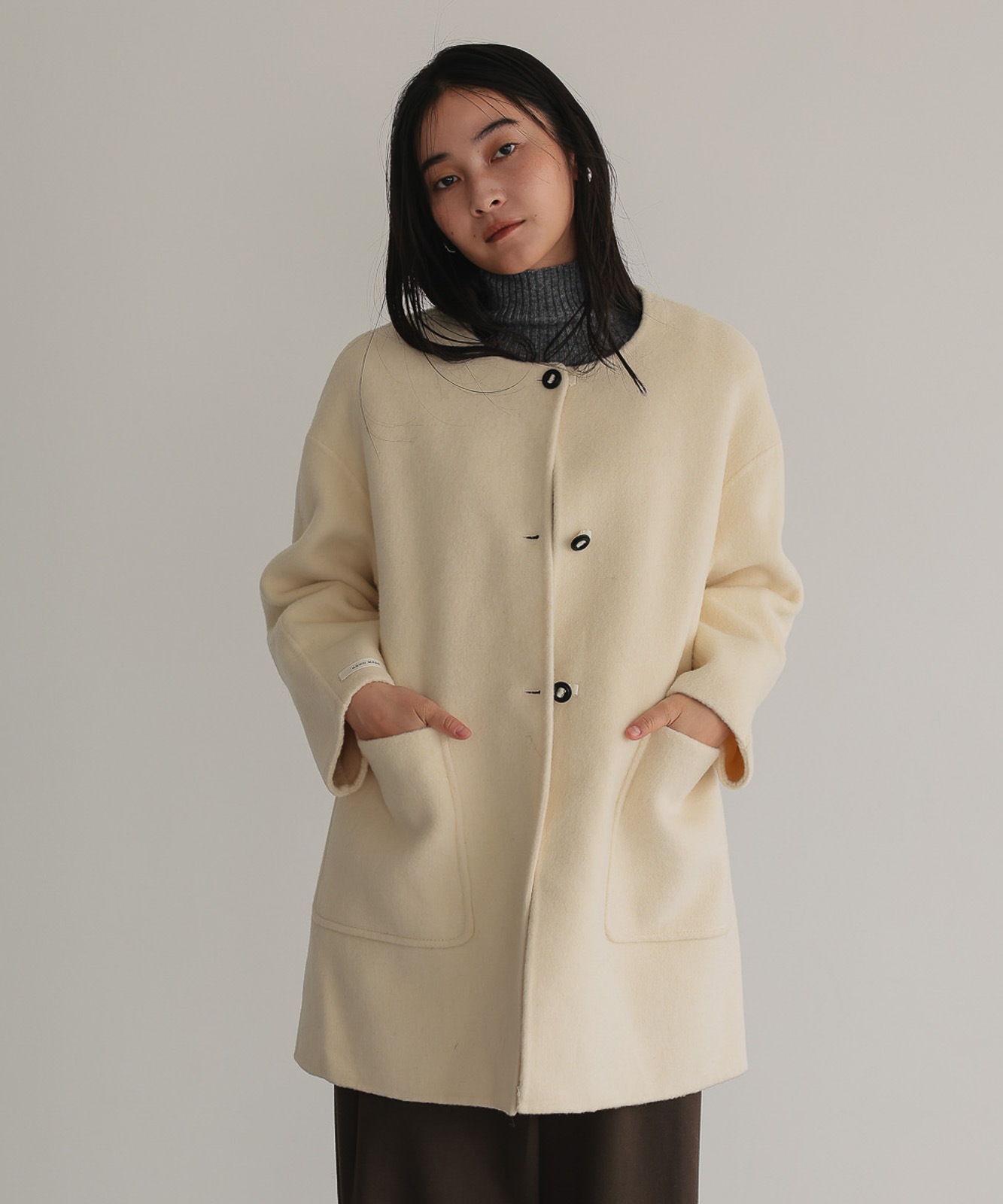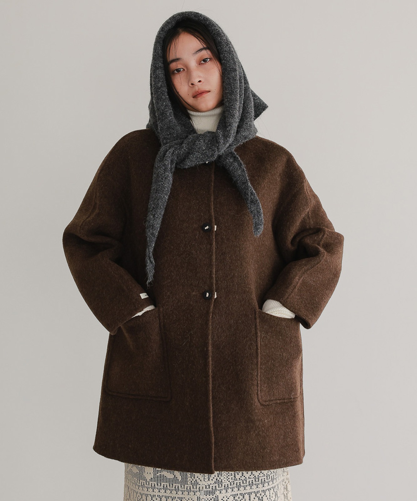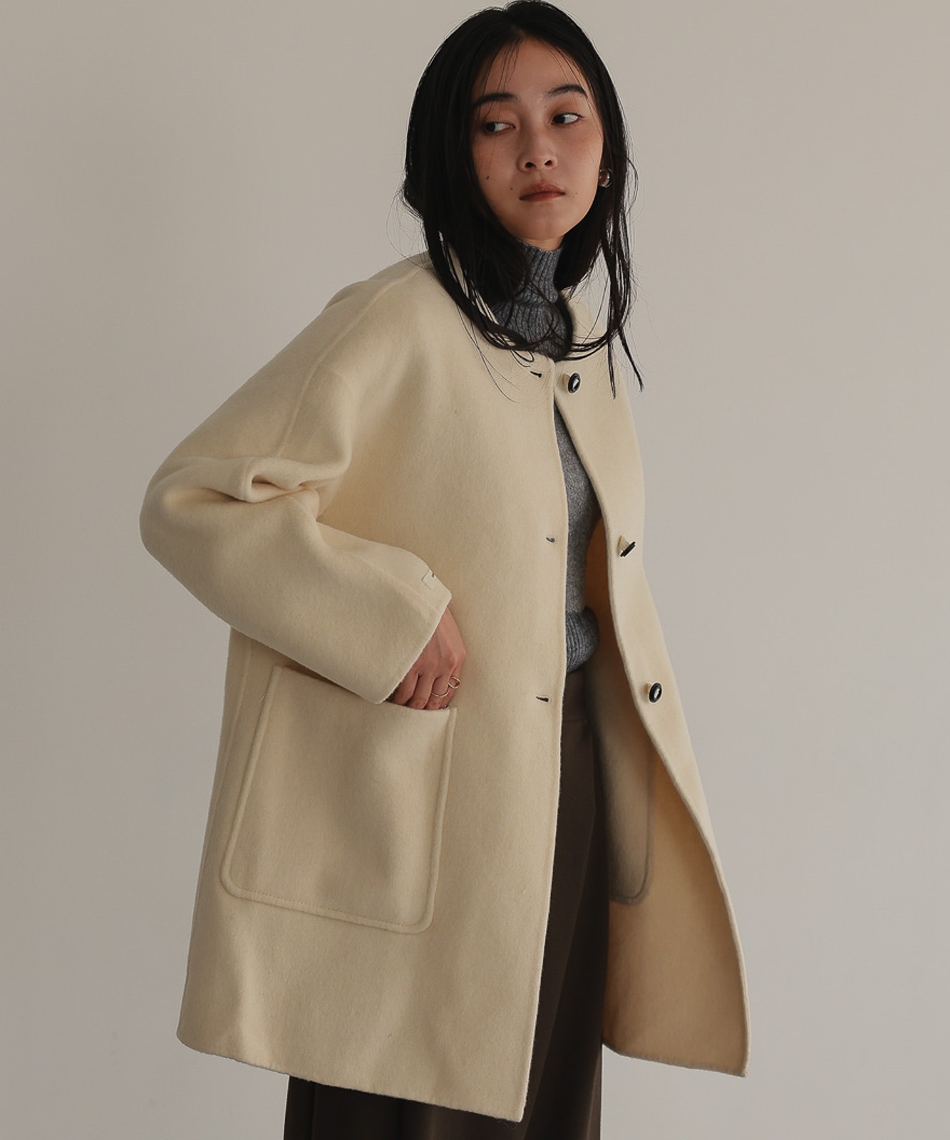 ストール付きコートは、オンオフ兼用のミドル丈で、程よいきちんと感が魅力。