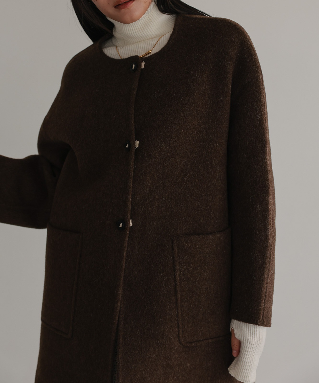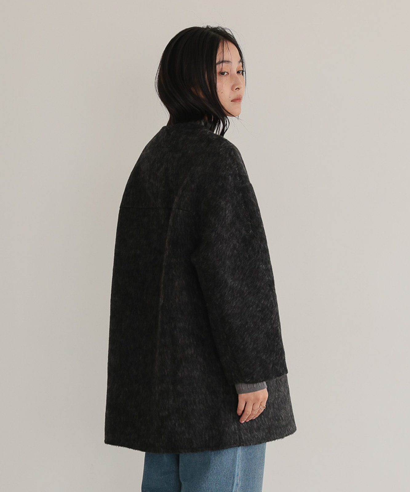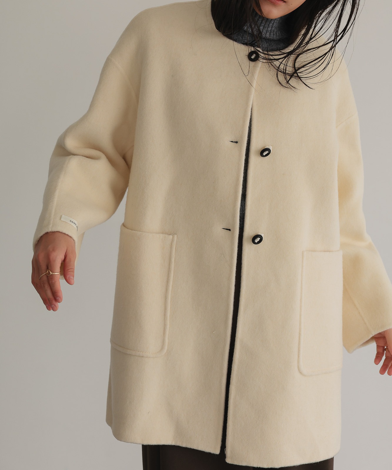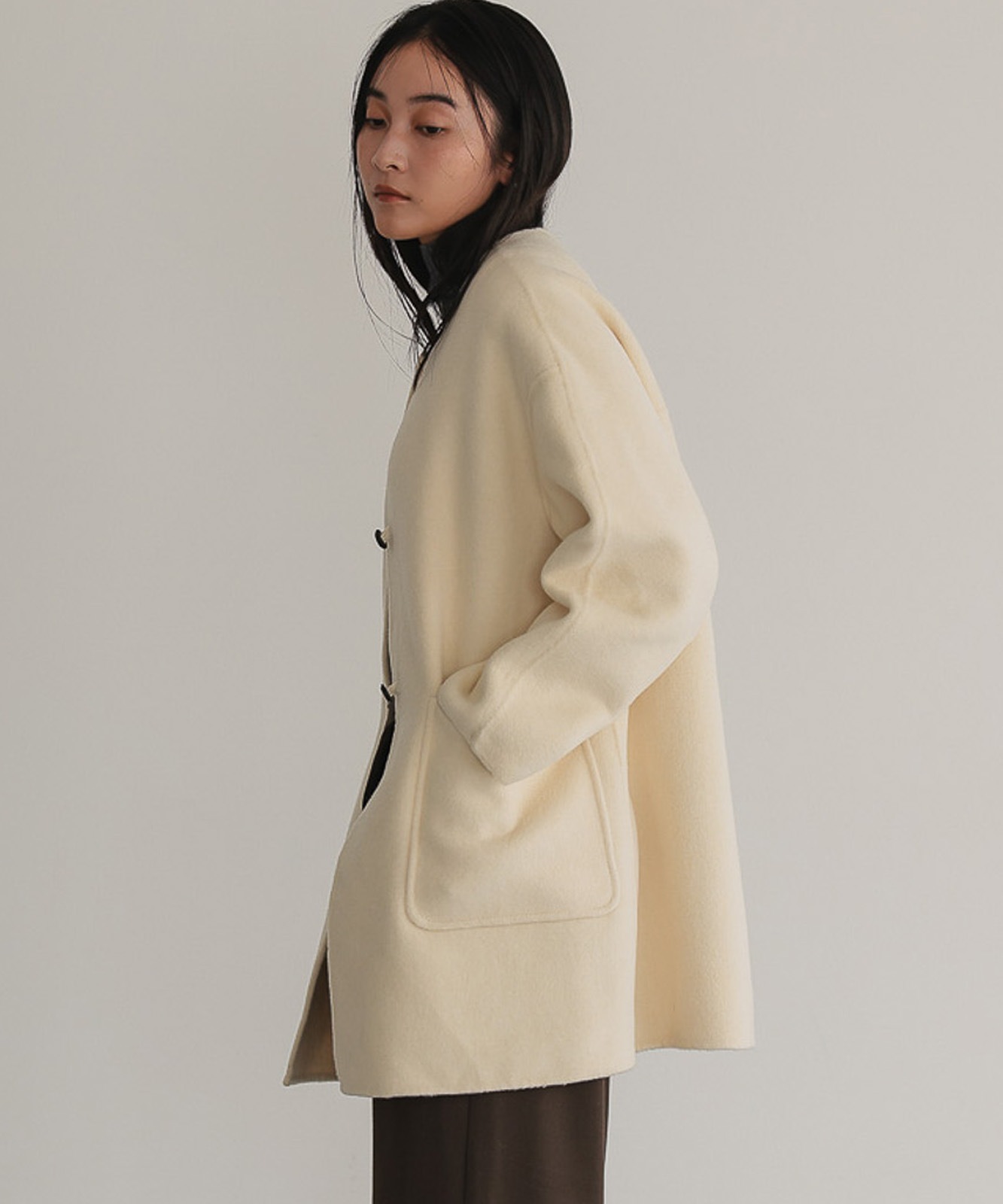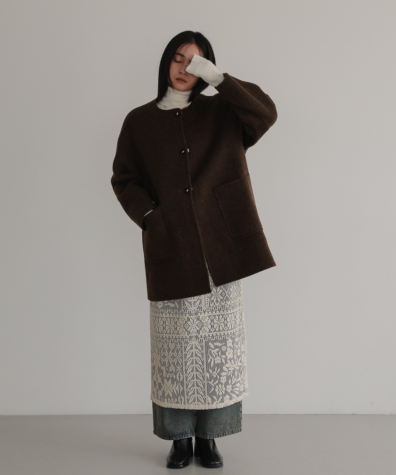 ストール付きコートは、オンオフ兼用のミドル丈で、程よいきちんと感が魅力。